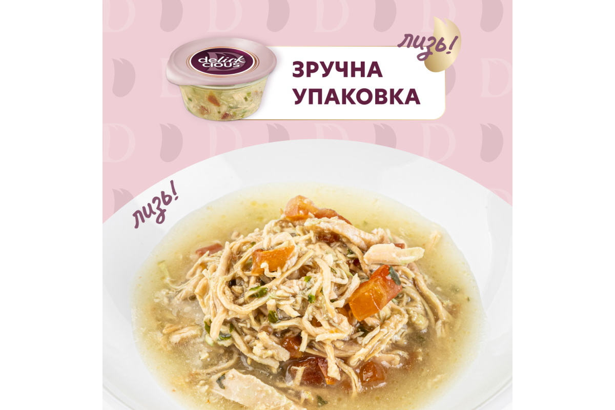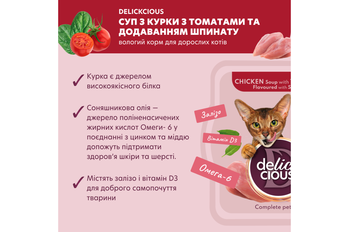 Delickcious Chicken Soup with Tomatoes Flavoured with Spinach суп з курки з томатами та додаванням шпинату. Повнораціонний корм для дорослих котів.