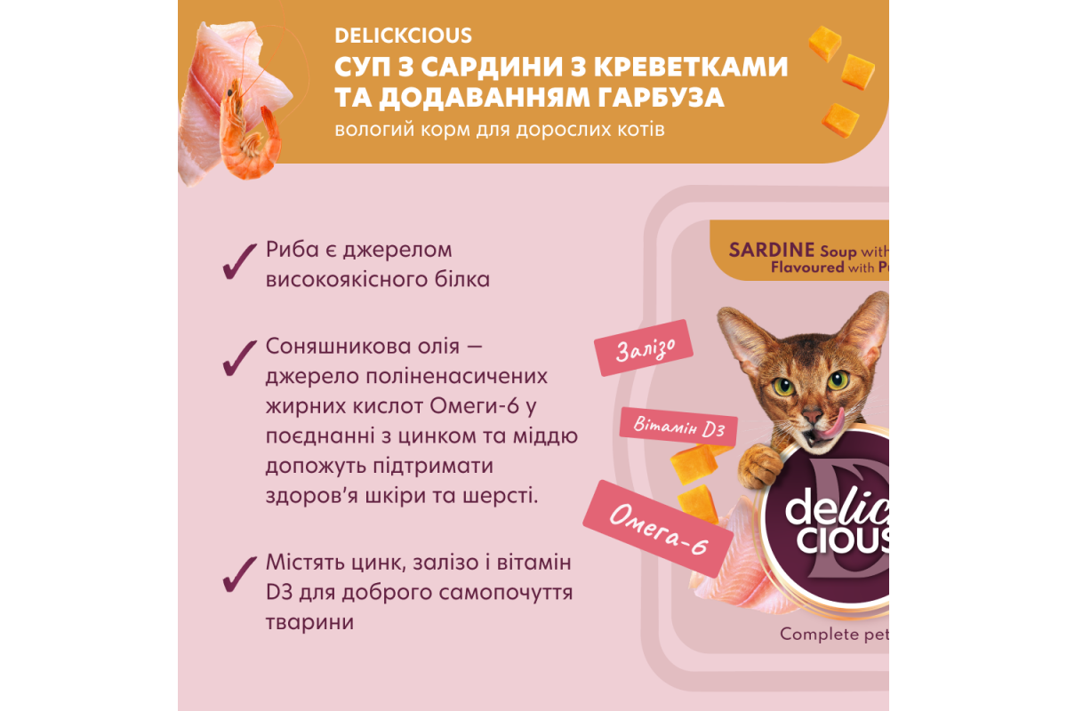 Delickcious Sardine Soup with Shrimps Flavoured with Pumpkin суп з сардини з креветками та додаванням гарбуза. Повнораціонний корм для дорослих котів.