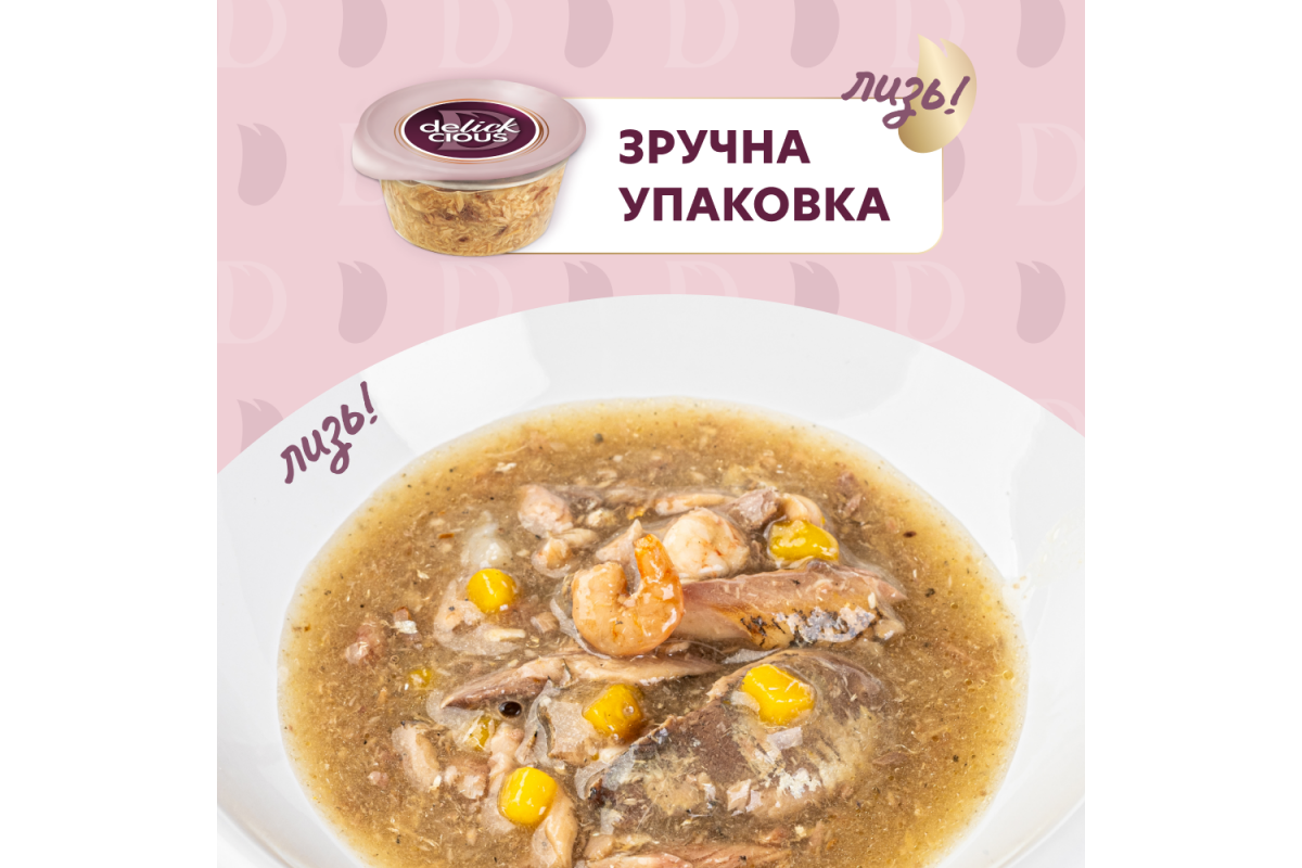 Вишукане поєднання відбірних інгредієнтів у супі для котів. Поживна сардина і цільні креветки — це щоденна порція делікатесного задоволення для вашого улюбленця. Поєднання текстур дарує коту задоволення і сприяє легкому засвоєнню. А збалансований склад дозволяє тварині насолоджуватися смаком і споживати усі необхідні вітаміни і мікроелементи. Делизькатес Delickcious. Не просто їжа, а вау-лизь!