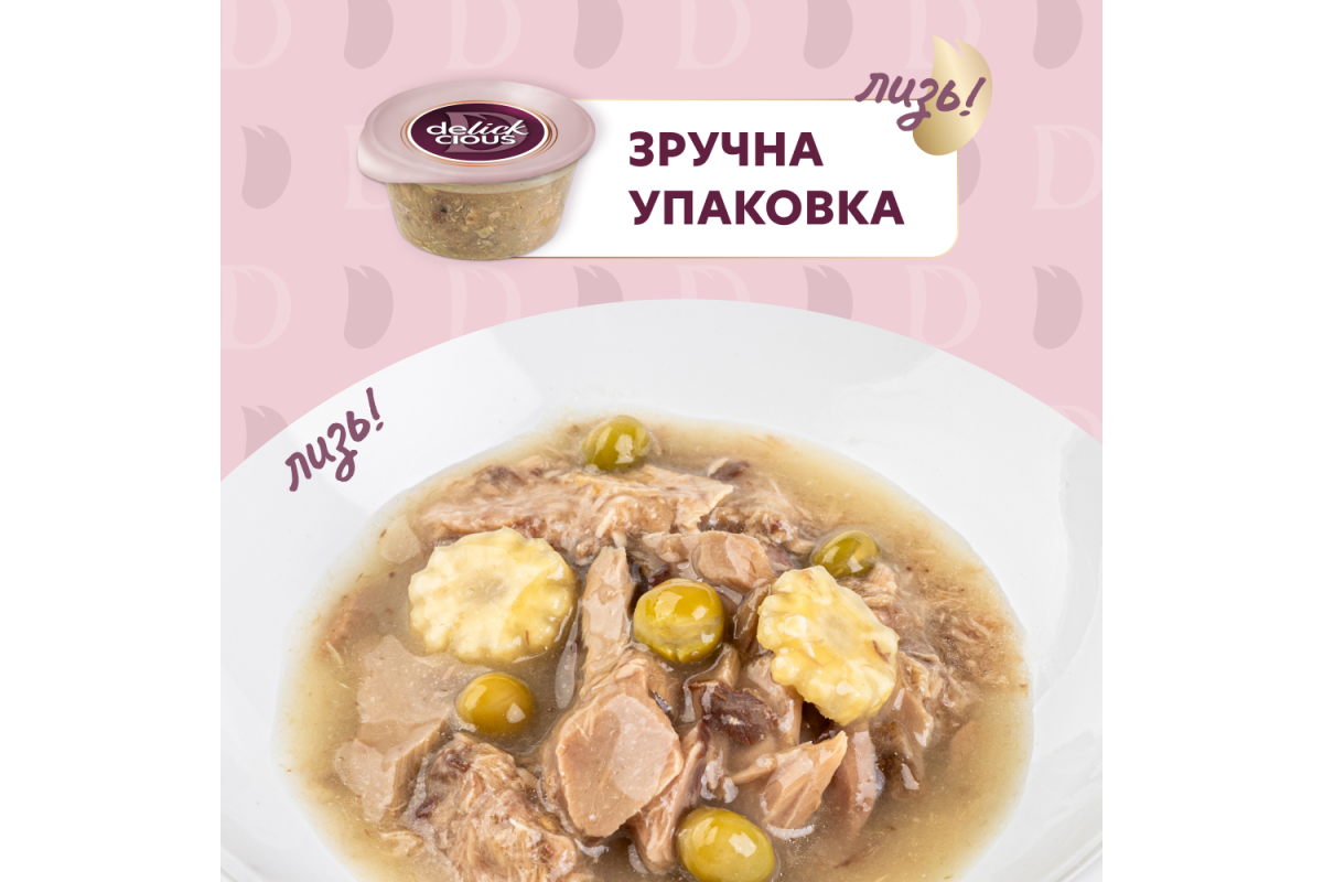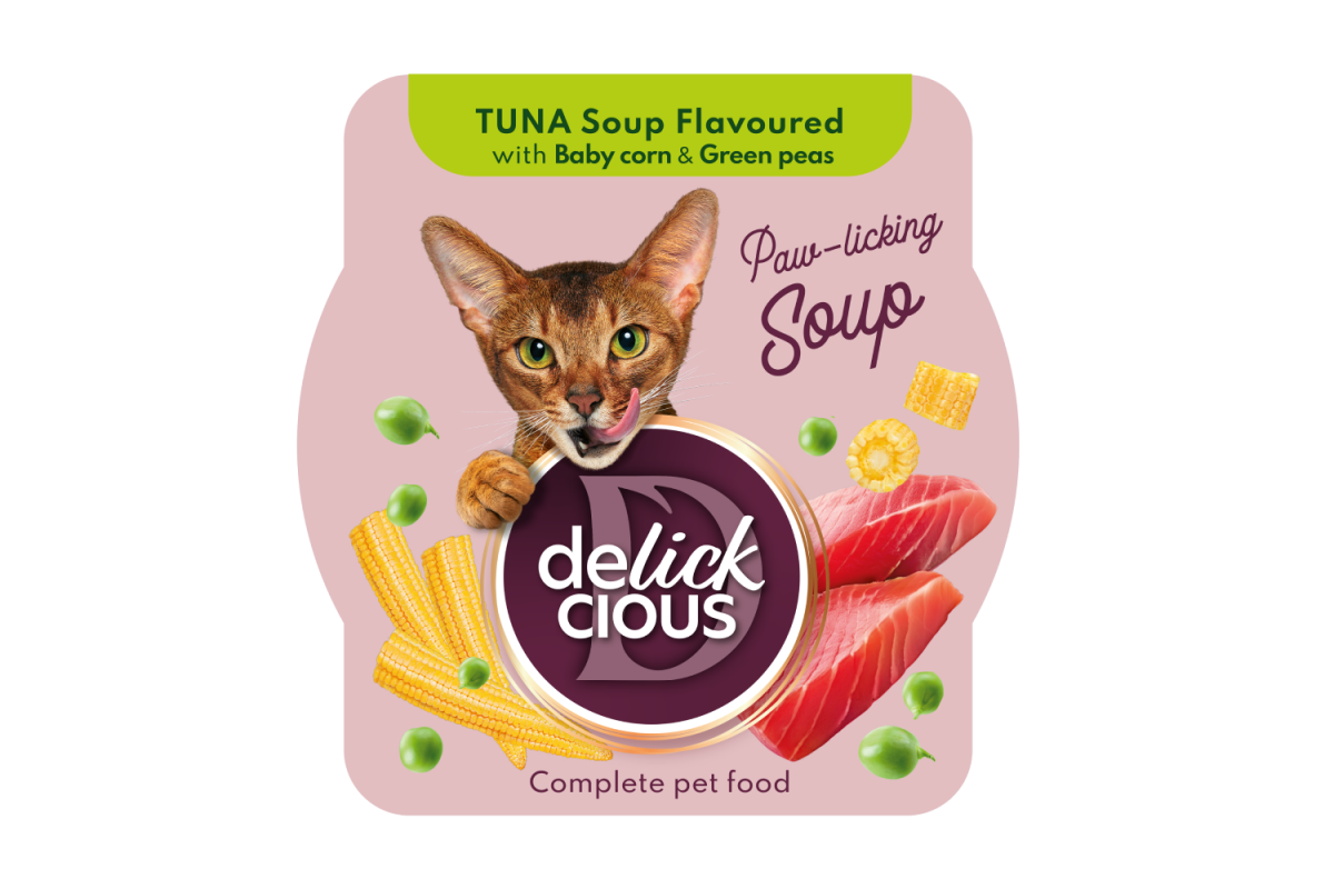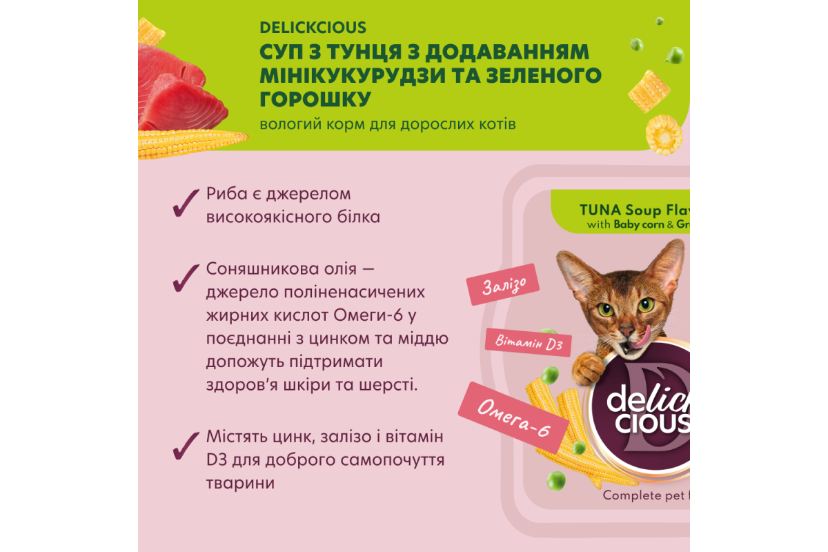 Delickcious Tuna Soup Flavoured with Baby corn & Green peas суп з тунця з додаванням мінікукурудзи та зеленого горошку. Повнораціонний корм для дорослих котів.