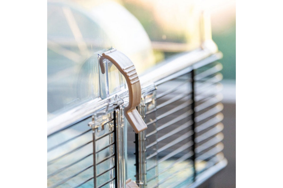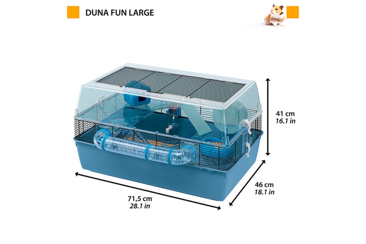 Duna Fun Large – велика клітка для хом'яків з широким піддоном. Ця простора модель складається з трьох рівнів, обладнаних усіма необхідними аксесуарами для вашого вихованця, включаючи гніздо, драбинки, напувалку, колесо та прозорі ігрові тунелі. Duna Fun Large складається з двох частин – даху та пластикового піддону, які оснащені ґратами для циркуляції повітря. Зручні грати нагорі повністю відкриваються, що полегшує процес щоденного прибирання. Нижня частина також повністю знімається на час збирання.