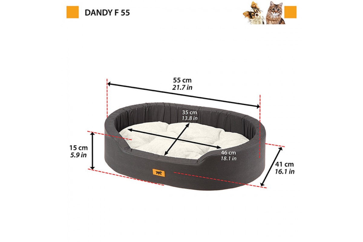 Dandy F ідеально підходить у будь-яку пору року. Це тканинний розплідник для собак у комплекті зі двосторонньою подушкою, що знімається. Подушка має бавовняну сторону, що ідеально підходить для більш теплого сезону, і подушку з екологічно чистого хутра для холодніших періодів.