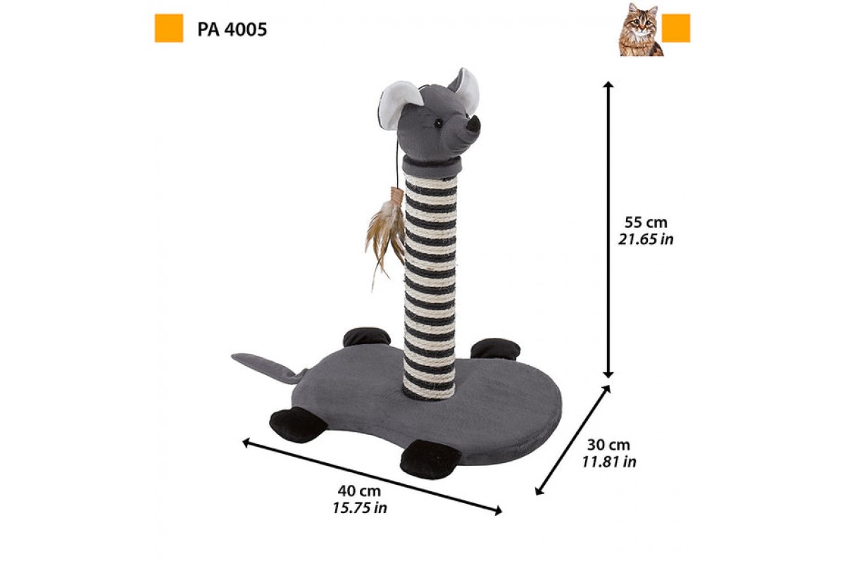 Представляємо вам кігтеточку із сизалю на дерев'яній основі з покриттям із штучного хутра. Нагорі розташована забавна іграшка у вигляді голови миші або мавпи для привернення уваги кішки.