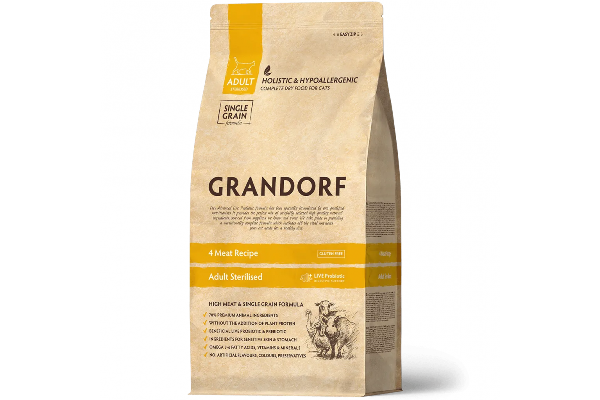 Сухий корм Grandorf 4 MEAT STERILISED, для стерилізованих котів, 4 види м'яса з пробіотиками, 8 кг