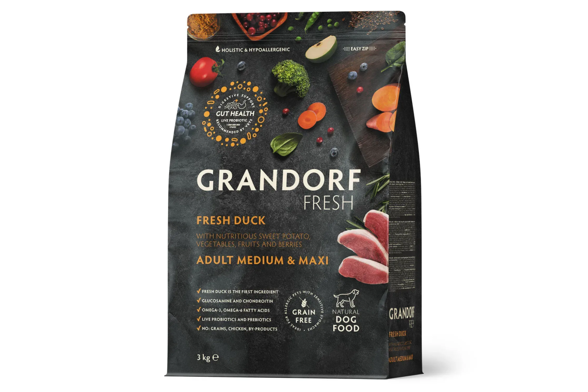 Сухий беззерновий корм Grandorf Fresh зі свіжим м’ясом качки та бататом — це повнораціонне збалансоване харчування холістик-класу, розроблене для дорослих собак середніх і великих порід. Формула враховує потреби тварин із чутливим травленням і схильністю до алергій. Основу складає свіже м’ясо качки — поживне джерело легко засвоюваного білка. Батат слугує корисним джерелом енергії та підтримує стабільну роботу травної системи. Завдяки натуральному складу без зерна, глютену та штучних домішок, раціон забезпечує здорове травлення і стабільний рівень енергії впродовж дня.