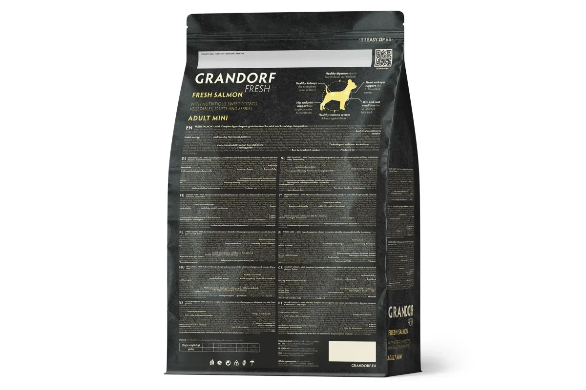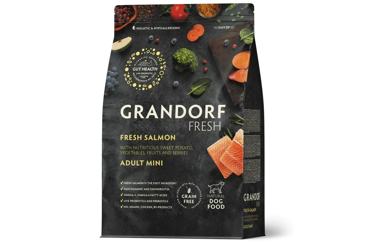 Сухий беззерновий корм Грандорф фреш зі свіжим лососем і бататом — це повнораціонне збалансоване харчування холістик-класу для дорослих собак малих порід. Рецептура розроблена спеціально для тварин із чутливим травленням та схильністю до алергій. Основу складає свіже м’ясо лосося — цінне джерело легко засвоюваного білка та корисних жирних кислот. Батат у складі забезпечує повільне вивільнення енергії та добре засвоюється організмом. Формула підійде для щоденного годування собак, яким потрібне дбайливе та збалансоване харчування.
