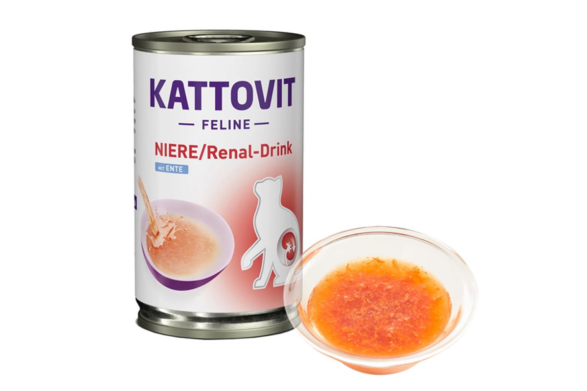Коли в кота порушена функція нирок, забезпечення достатнього споживання рідини набуває особливого значення для підтримання його здоров’я. Kattovit Veterinary Niere Renal з качкою – це смачний лікувальний напій, призначений спеціально для таких випадків. М’який м’ясний бульйон із додаванням ніжних шматочків курячого та качиного філе не тільки привабливий за смаком, а й мотивує улюбленця пити більше, навіть якщо в нього зазвичай знижене бажання споживати воду. Високий вміст вологи в раціоні допомагає знизити навантаження на нирки, сприяє їхньому підтриманню та поліпшує загальне самопочуття кота.