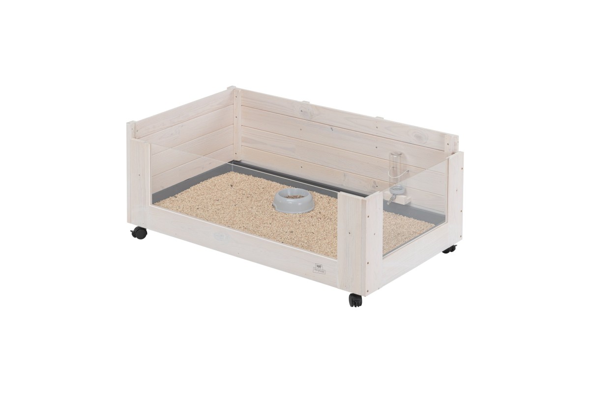 Сучасний дизайн із прозорими пластиковими стінками забезпечує повний огляд тварини, полегшуючи щоденне спостереження. Верхня частина повністю відкрита, що забезпечує легкий доступ для спілкування з вихованцем та виконання завдань з догляду та прибирання. Дерево захищене нетоксичною фарбою на водній основі, що гарантує безпеку та благополуччя тварини та продовжує термін служби виробу. Крім того, знявши прозору передню частину, можна встановити практичну драбинку, що дозволяє морській свинці вільно входити і виходити, з цікавістю вивчаючи навколишній простір.