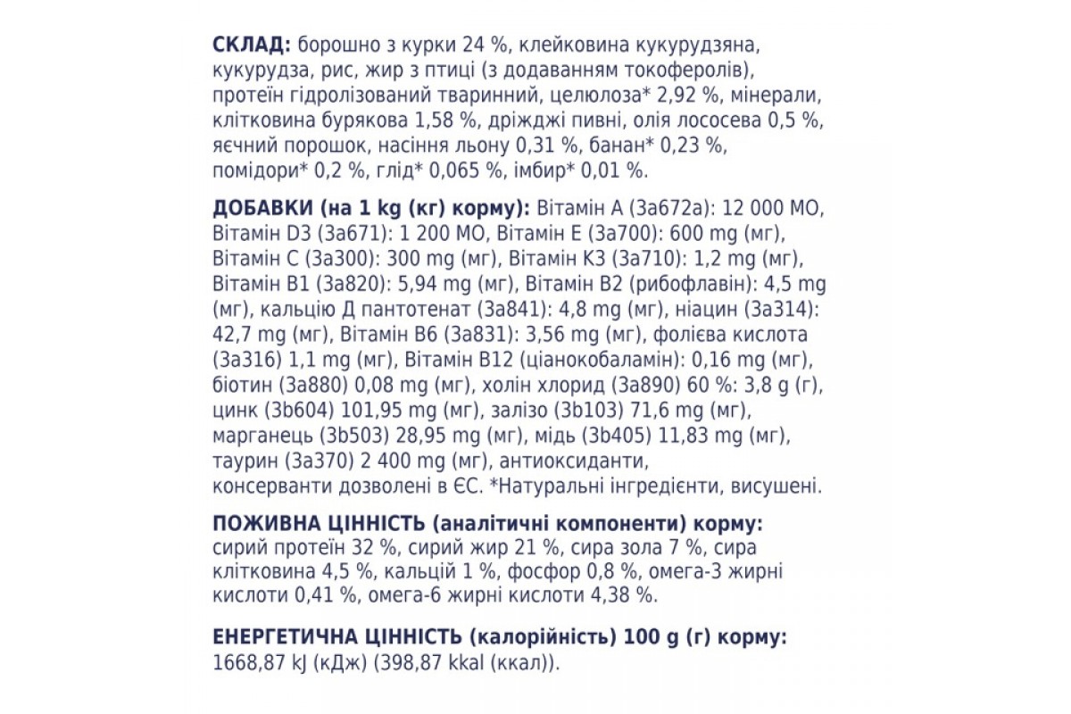 Добавки (на 1 kg (кг) корму): Вітамін А (3а672а): 12 000 МО, Вітамін D3 (3а671): 1 200 МО, Вітамін Е (3а700): 600 mg (мг), Вітамін С (3а300): 300 mg (мг), Вітамін K3 (3а710): 1,2 mg (мг), Вітамін В1 (3а820): 5,94 mg (мг), Вітамін В2 (рибофлавін): 4,5 mg (мг), кальцію Д пантотенат (3а841): 4,8 mg (мг), ніацин (3а314): 42,7 mg (мг), Вітамін В6 (3а831): 3,56 mg (мг), фолієва кислота (3а316) 1,1 mg (мг), Вітамін В12 (ціанокобаламін): 0,16 mg (мг), біотин (3а880) 0,08 mg (мг), холін хлорид (3а890) 60 %: 3,8 g (г), цинк (3b604) 101,95 mg (мг), залізо (3b103) 71,6 mg (мг), марганець (3b503) 28,95 mg (мг), мідь (3b405) 11,83 mg (мг), таурин (3a370) 2 400 mg (мг), антиоксиданти, консервант дозволені в ЄС. *Натуральні інгредієнти, висушені.