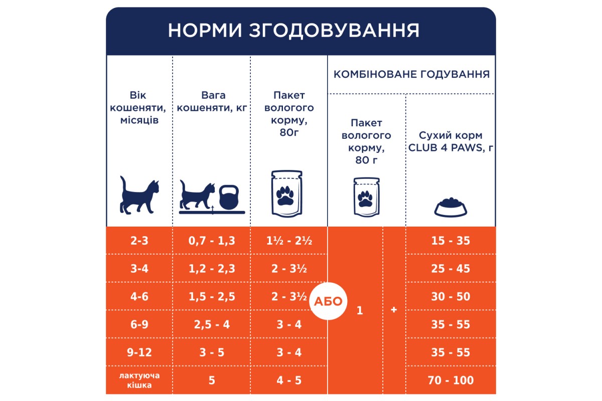 Однак, не допускайте перегодовування. Інформативна таблиця годування допоможе визначити правильний розмір порції відповідно до ваги вашого вихованця.