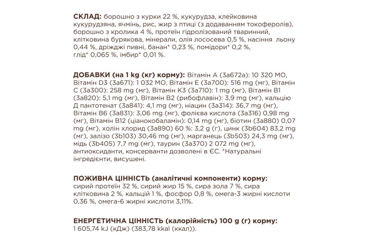 Склад: борошно з курки 22 %, кукурудза, клейковина кукурудзяна, ячмінь, рис, жир з птиці (з додаванням токоферолів), борошно з кролика 4 %, протеїн гідролізований тваринний, клітковина бурякова, мінерали, олія лососева 0,4% 0,2%, глід * 0,065%, імбир * 0,01%.