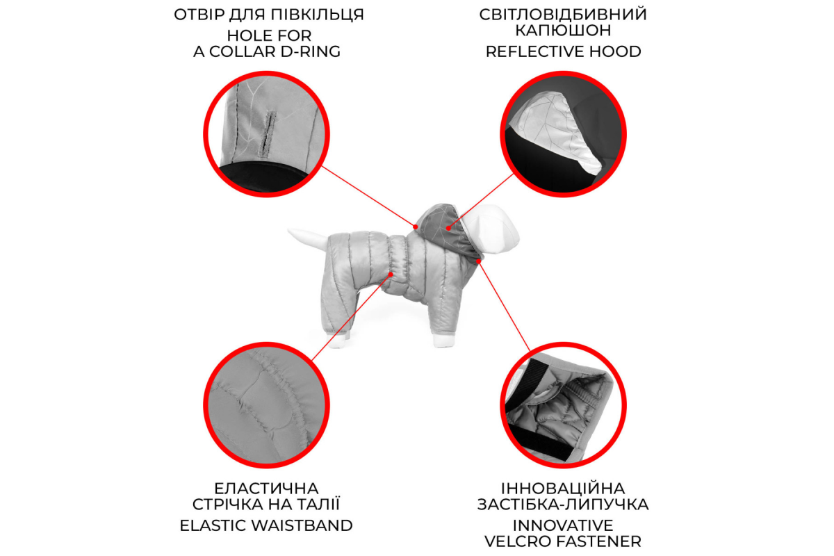 Стильний дизайн комбінезона виділить вашого собаку серед інших, а світовідбивний капюшон забезпечить безпеку собаки в темний час доби.