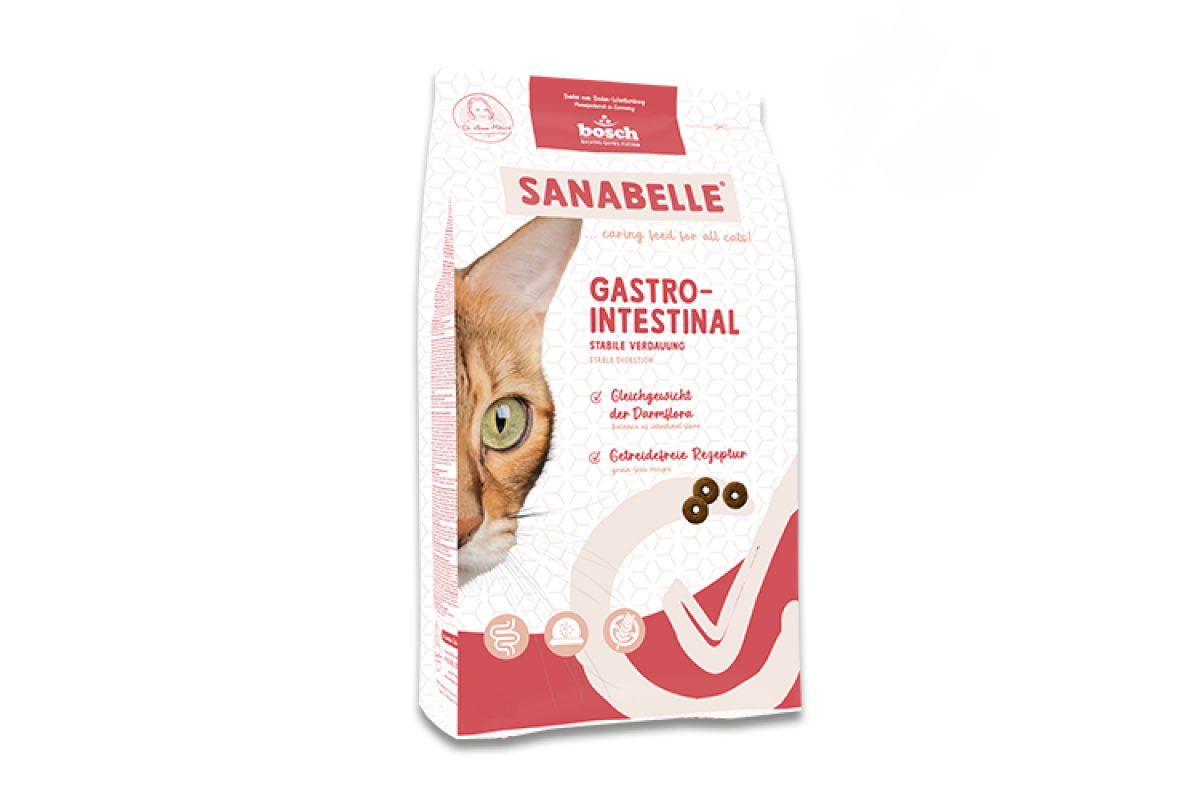 Sanabelle Gastrointestinal був спеціально розроблений для оптимальної підтримки чутливої травної системи котів, чутливих до поживних речовин. Особливо висока засвоюваність та підвищена енергетична щільність помітно полегшують шлунково-кишковий тракт та сприяють швидкій регенерації - ідеально підходить після ветеринарного лікування або хронічних проблем з травленням.