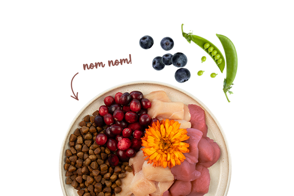 Свіже куряче м'ясо (20%), ячмінь, кукурудза, білок птиці (сушений), шкварки (сушені), кукурудзяний білок, свіжа цесарка (5%), горохова клітковина, гідролізат білка, сушений буряковий жом (видалений цукор), тваринний жир, рис (1%), печінкове борошно, лососева олія (0,5%), карбонат кальцію, горох (сушений, 0,4%), хлорид калію, брусниця (сушена, 0,1%), чорниця (сушена, 0,1%), сушена петрушка (0,1%), дріжджі (сушені, 0,1%), квіти чорнобривців (сушені, 0,05%).