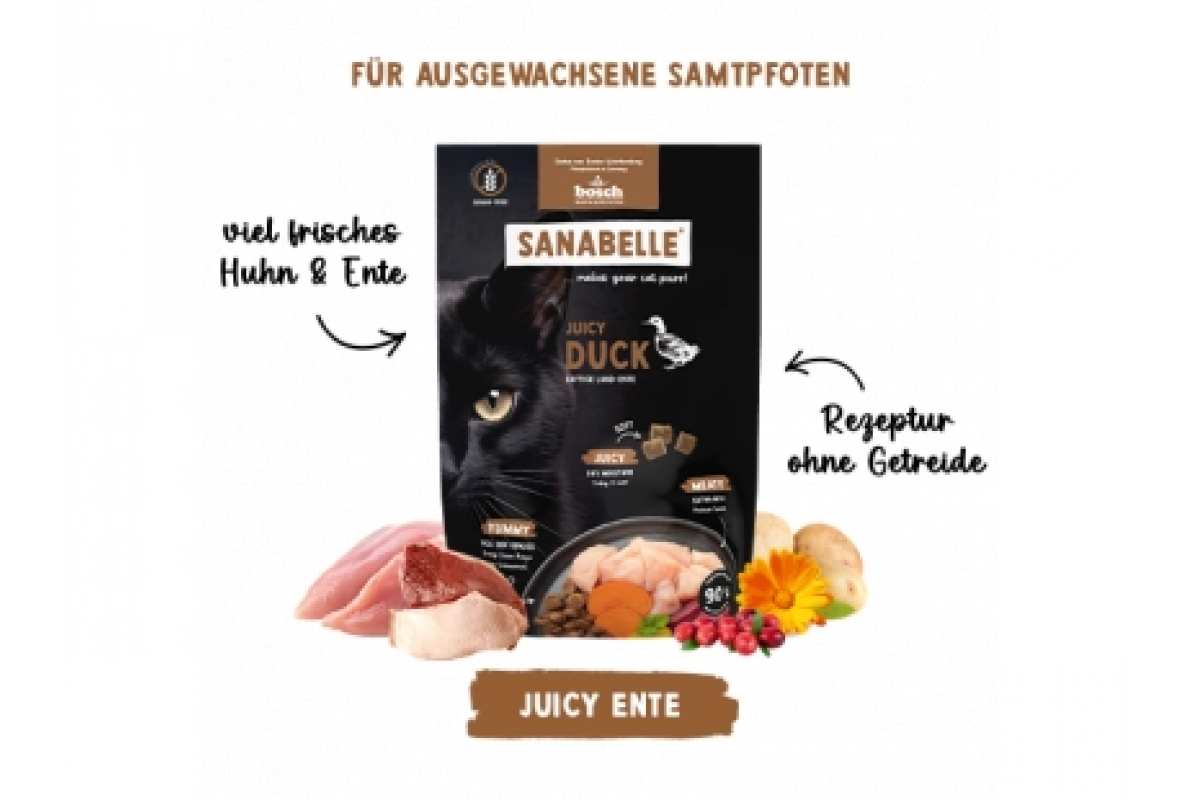 Sanabelle Juicy Juicy Land-Ente - це повнораціонний сухий корм для дорослих кішок від 12 місяців, створений для тих, хто цінує насичений смак та високу поживність. У його складі - свіжа качка та ніжна курятина, які забезпечують 90% тваринного білка для енергії, сили м’язів та чудової засвоюваності.