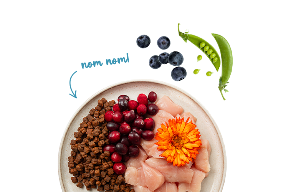 Свіже куряче м'ясо (25%), кукурудза, білок птиці (сушений), тваринний жир, шкварки (сушені), ячмінь, кукурудзяний білок, гідролізат білка, лососева олія (1%), рис (1%), горох (сушений, 0,8%), печінкове борошно, карбонат кальцію, хлорид калію, дріжджі (сушені, 0,2%), брусниця (сушена, 0,1%), чорниця (сушена, 0,1%), петрушка (сушена, 0,1%), квіти чорнобривців (сушені, 0,05%).