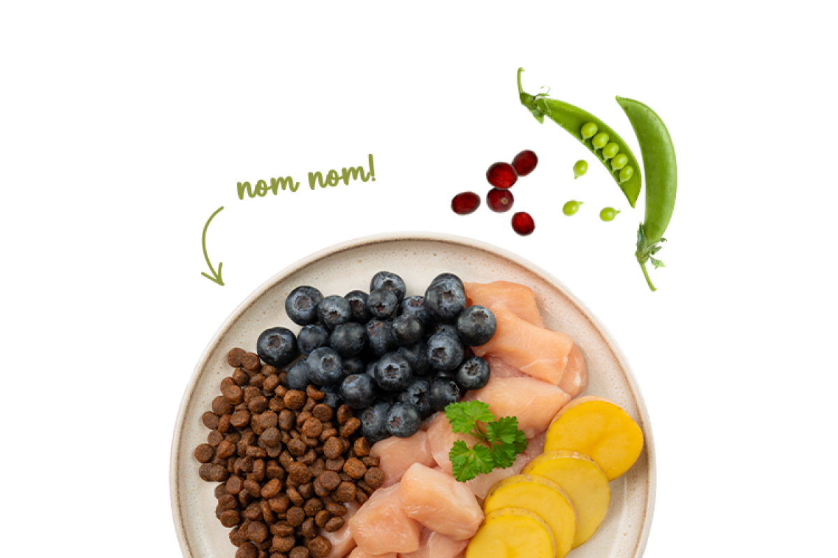 Свіже куряче м'ясо (25 %), картопляне борошно (17,5 %), картопляний крохмаль, білок птиці (сушений), шкварки (сушені), картопляний білок, тваринний жир, насіння льону, гідролізат білка, сушений буряковий жом (без цукру), печінкове борошно, горохова клітковина, горох (сушений, 0,5 %), лососева олія (0,5 %), карбонат кальцію, брусниця (сушена, 0,1 %), чорниця (сушена, 0,1 %), петрушка (сушена, 0,1 %), дріжджі (сушені, 0,1 %), квіти чорнобривців (сушені, 0,05 %).