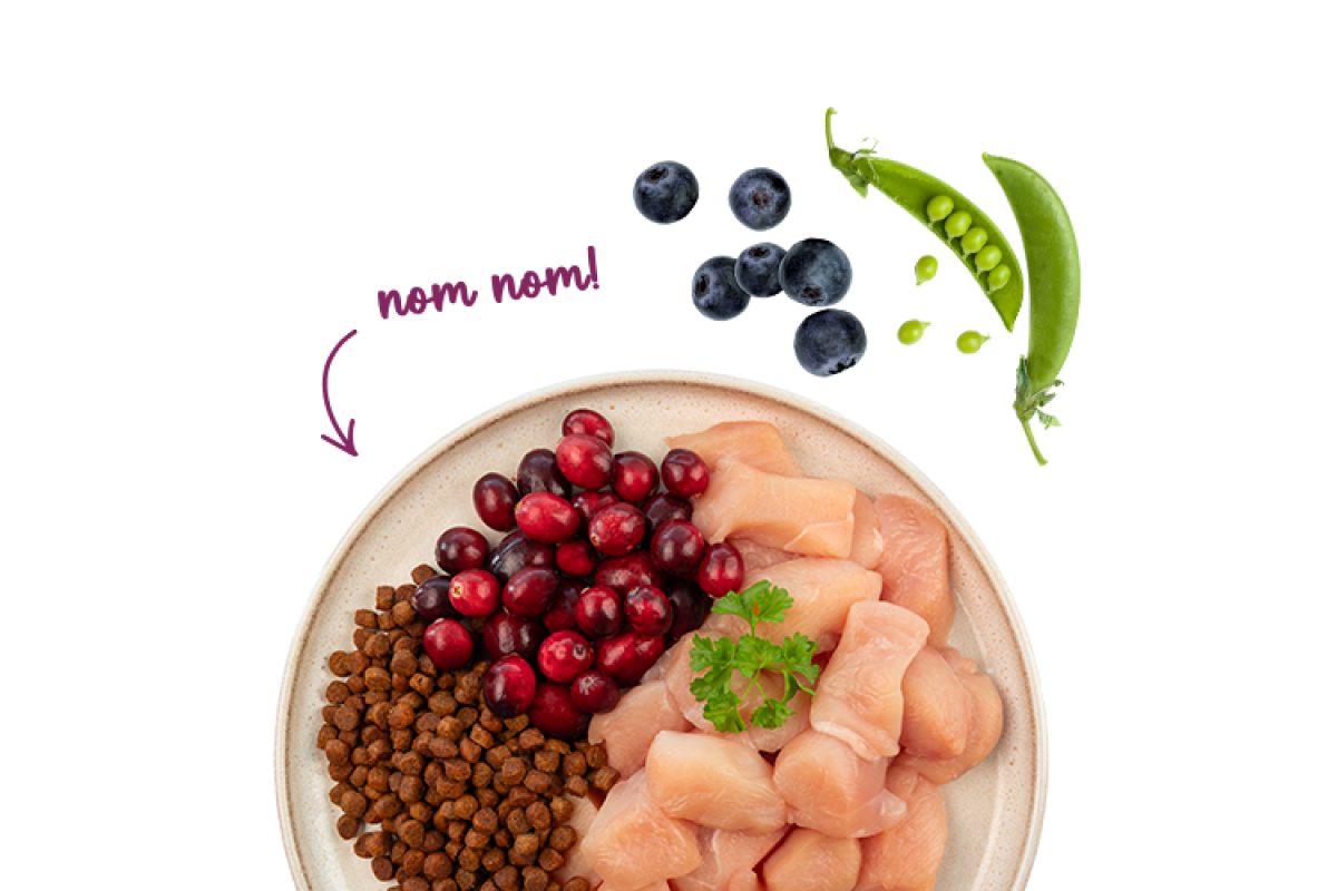 Свіже куряче м'ясо (20%), ячмінь, кукурудза, білок птиці (сушений), сушений буряковий жом (без цукру), шкварки (сушені), кукурудзяний білок, тваринний жир, гідролізат білка, целюлоза, рис (1%), насіння льону, горох (сушений, 0,8%), борошно з печінки, карбонат кальцію, лососева олія (0,5%), хлорид калію, хлорид натрію, брусниця (сушена, 0,1%), чорниця (сушена, 0,1%), сушена петрушка (0,1%), дріжджі (сушені, 0,1%), квіти чорнобривців (сушені, 0,05%).