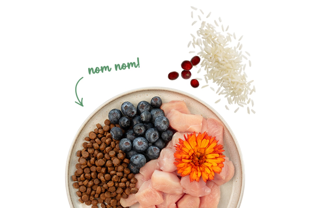 Свіже куряче м'ясо (25%), кукурудза, білок птиці (сушений), тваринний жир, шкварки (сушені), рис (4%), гідролізат білка, рисове борошно, кукурудзяний білок, горохова клітковина, рибне борошно, борошно з печінки, карбонат кальцію, лососева олія (0,5%), хлорид калію, брусниця (сушена, 0,1%), чорниця (сушена, 0,1%), петрушка (сушена, 0,1%), дріжджі (сушені, 0,1%), квіти чорнобривців (сушені, 0,05%).