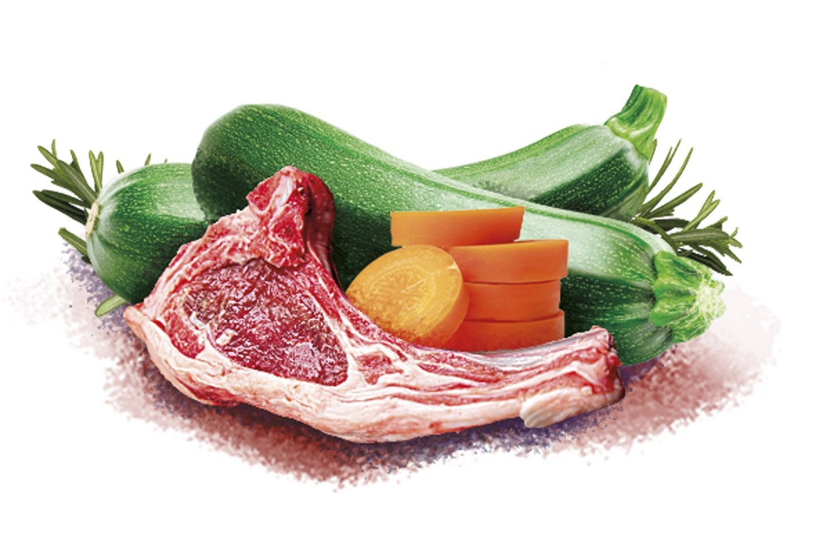 Склад: ягня 70 %, морква 4 %, цукіні 4 %, горохове борошно 3 %, лігноцелюлоза 1 %, розмарин 0,5 %, карбонат кальцію 0,3 %.
