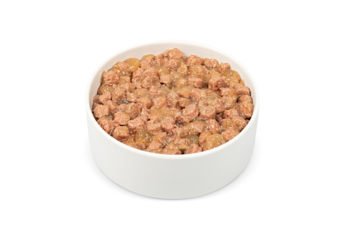 Склад: м'ясо та продукти тваринного походження не менше 85% у шматочках (зокрема з курки – 54%, з яловичини – 24%, з індички – 7%), злаки. Шматочки становлять не менше 50%.