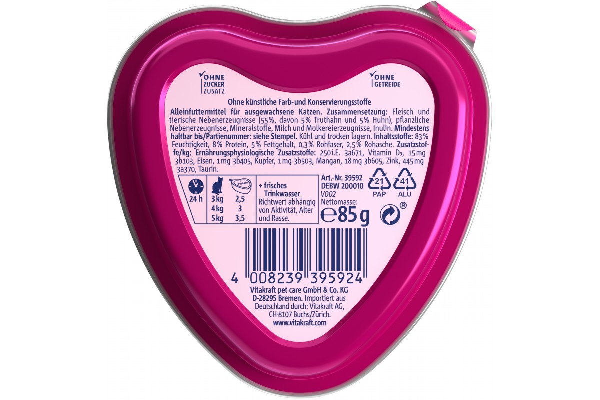 Повнораціонний вологий корм високої якості, у формі серденька. Узгоджений з харчовими потребами дорослих котів. Має неперевершений смак, завдяки шматочкам інгредієнтів, що легко розпізнати, та апетитному соусу. Без цукру, без консервантів та барвників.