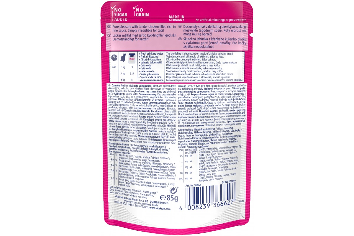 Повнораціонний вологий корм високої якості, у паучах. Адаптований до щоденних харчових потреб котів. Помітні шматочки м'яса або риби в смачному соусі. Не містить консервантів, доданих ароматизаторів та барвників.