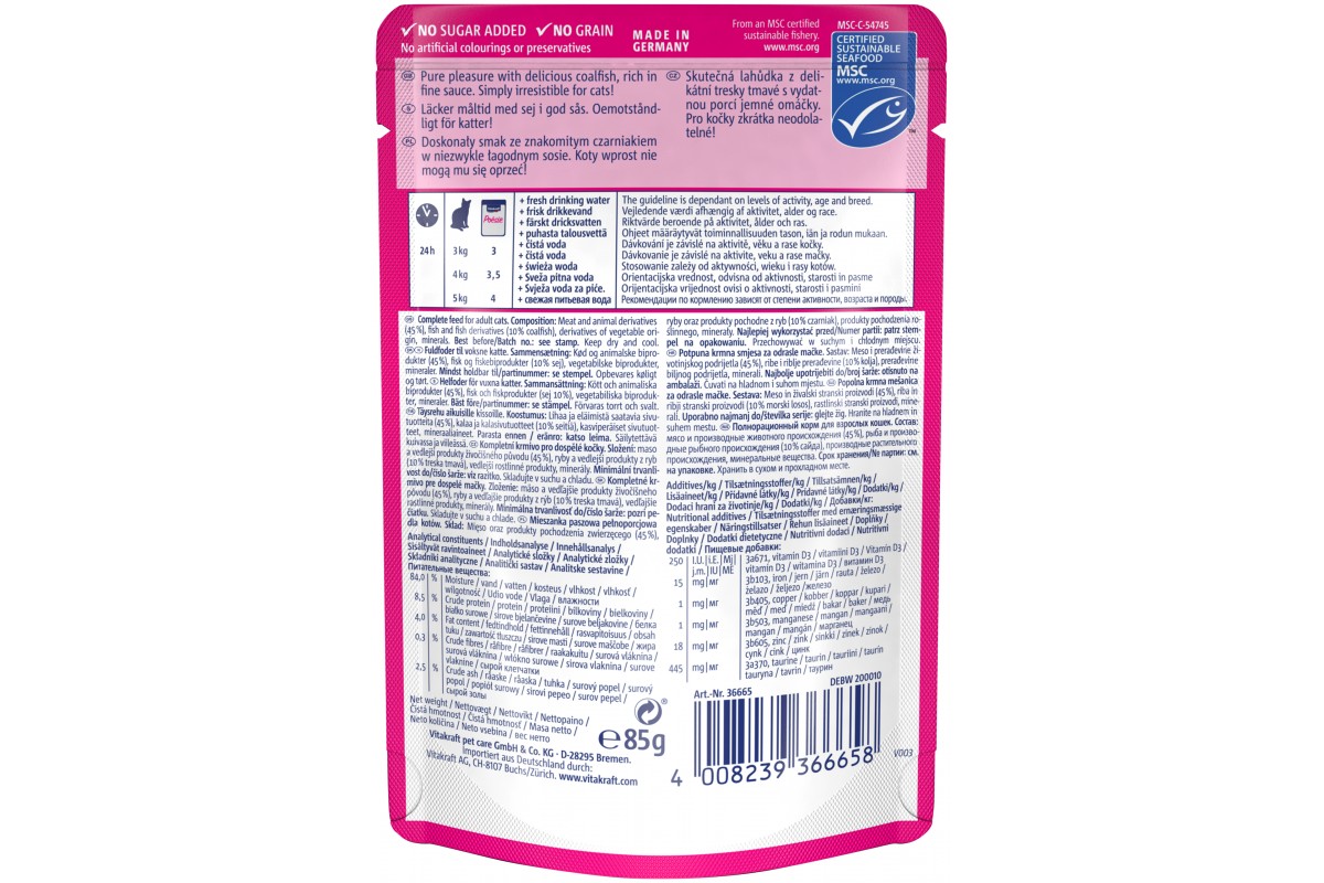 Повнораціонний вологий корм високої якості, у паучах. Адаптований до щоденних харчових потреб котів. Помітні шматочки м'яса або риби в смачному соусі. Не містить консервантів, доданих ароматизаторів та барвників.
