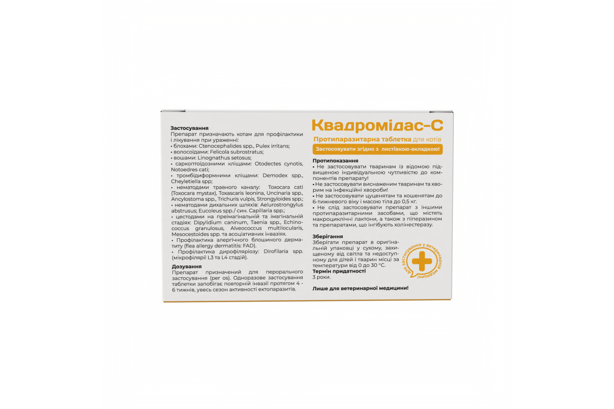 Квадромідас-С протипаразитарна таблетка для котів — паразитицидний засіб у вигляді таблеток, що застосовується для профілактики та лікування котів від ектопаразитів (членистоногих: бліх, волосоїдів, вошей, кліщів тощо), а також проти ендопаразитів (нематод, цестод).