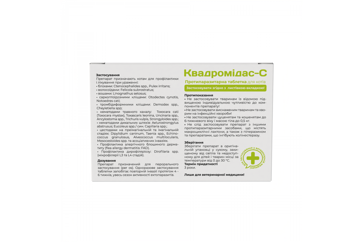 Квадромідас-С протипаразитарна таблетка для котів — паразитицидний засіб у вигляді таблеток, що застосовується для профілактики та лікування котів від ектопаразитів (членистоногих: бліх, волосоїдів, вошей, кліщів тощо), а також проти ендопаразитів (нематод, цестод).