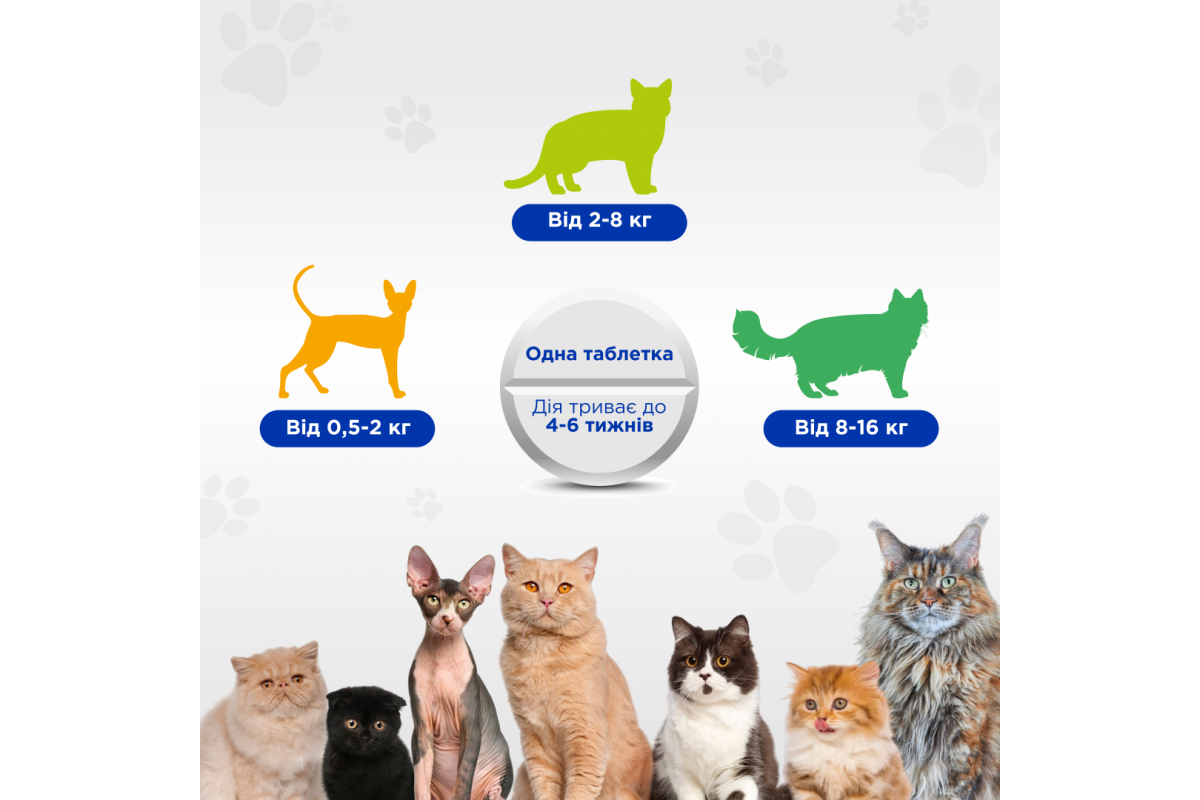 люфенурон — 10,0; нітенпірам — 3,0; селамектин — 0,3; празіквантел — 5,0.