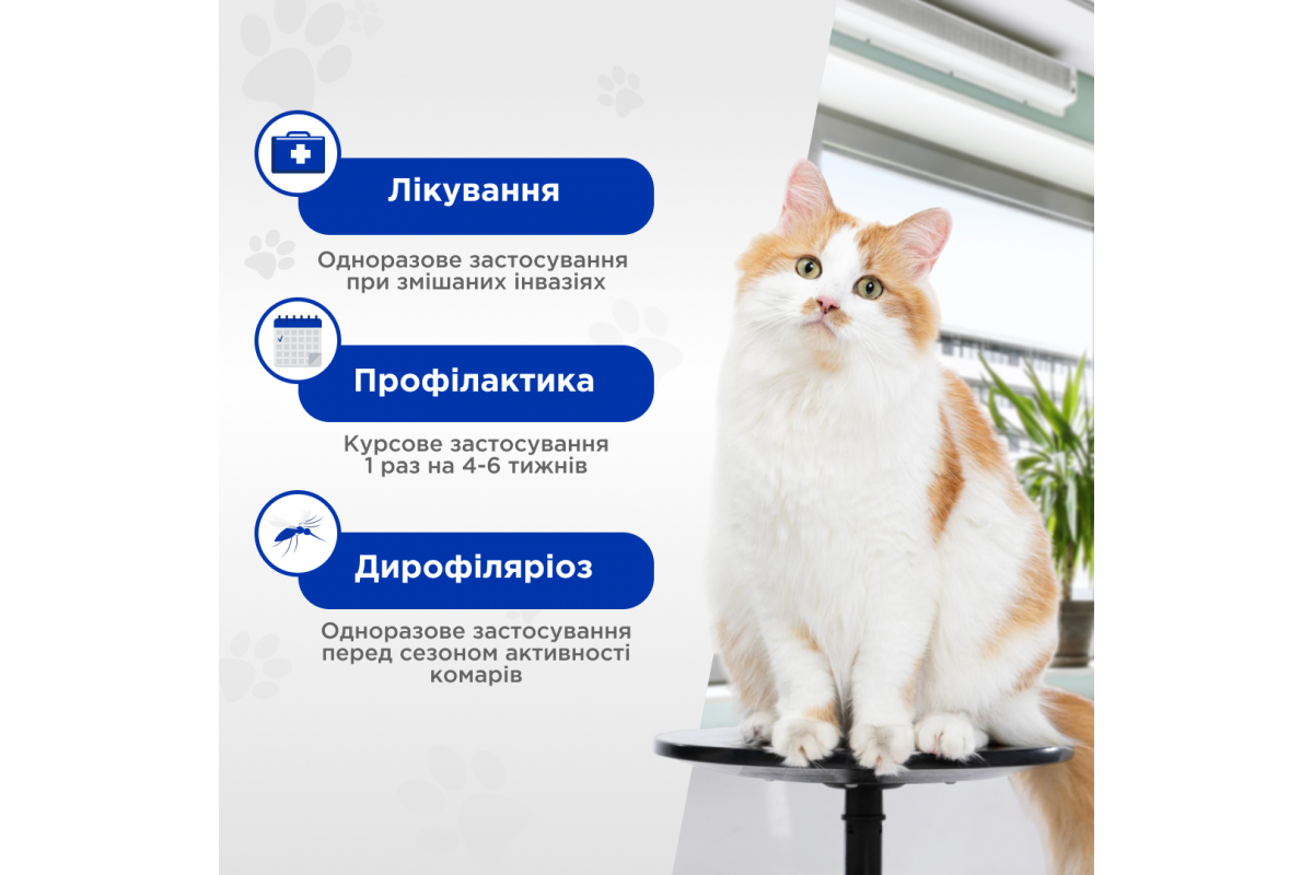 - Профілактика дирофіляріозу (Dirofilaria spp. (мікрофілярії L3 та L4 стадій).