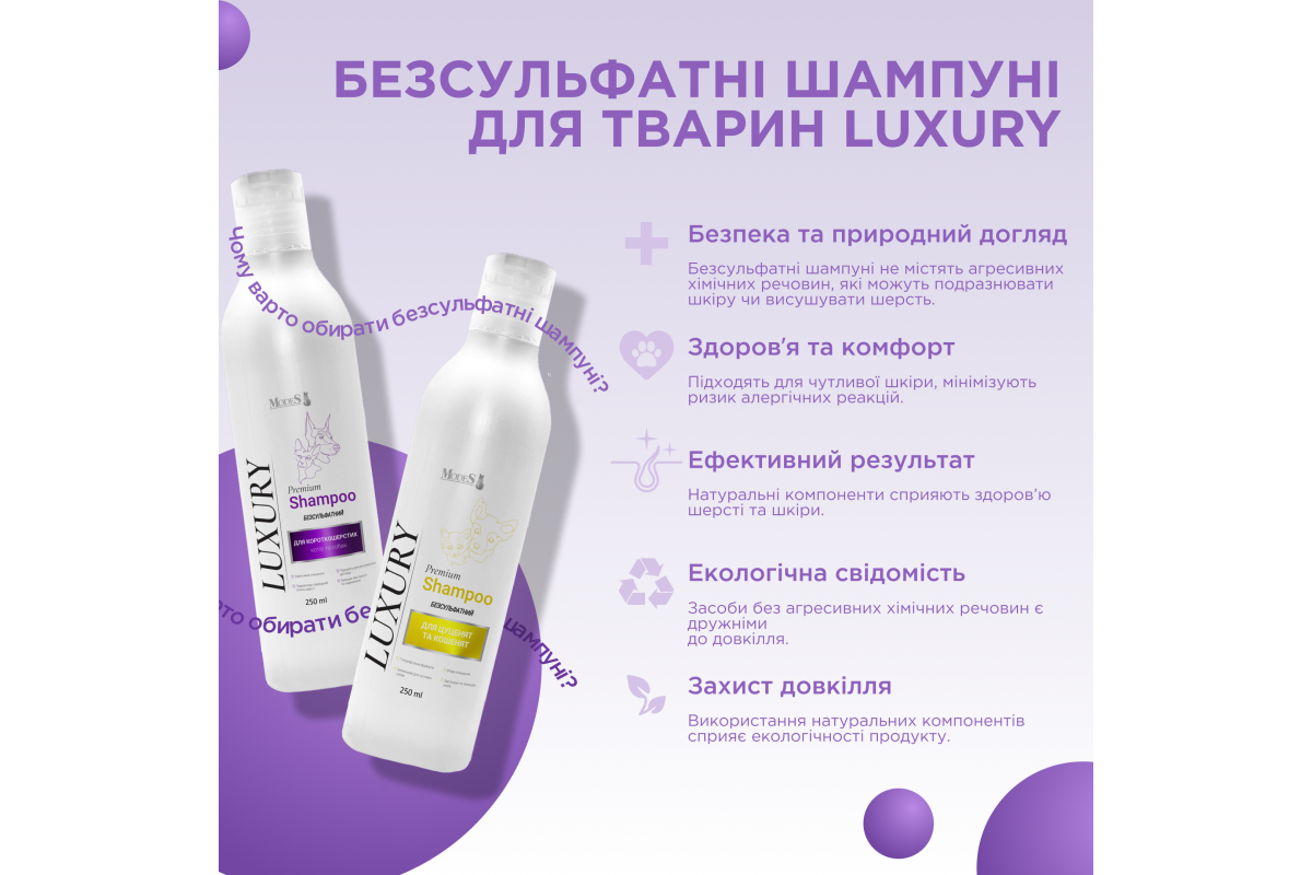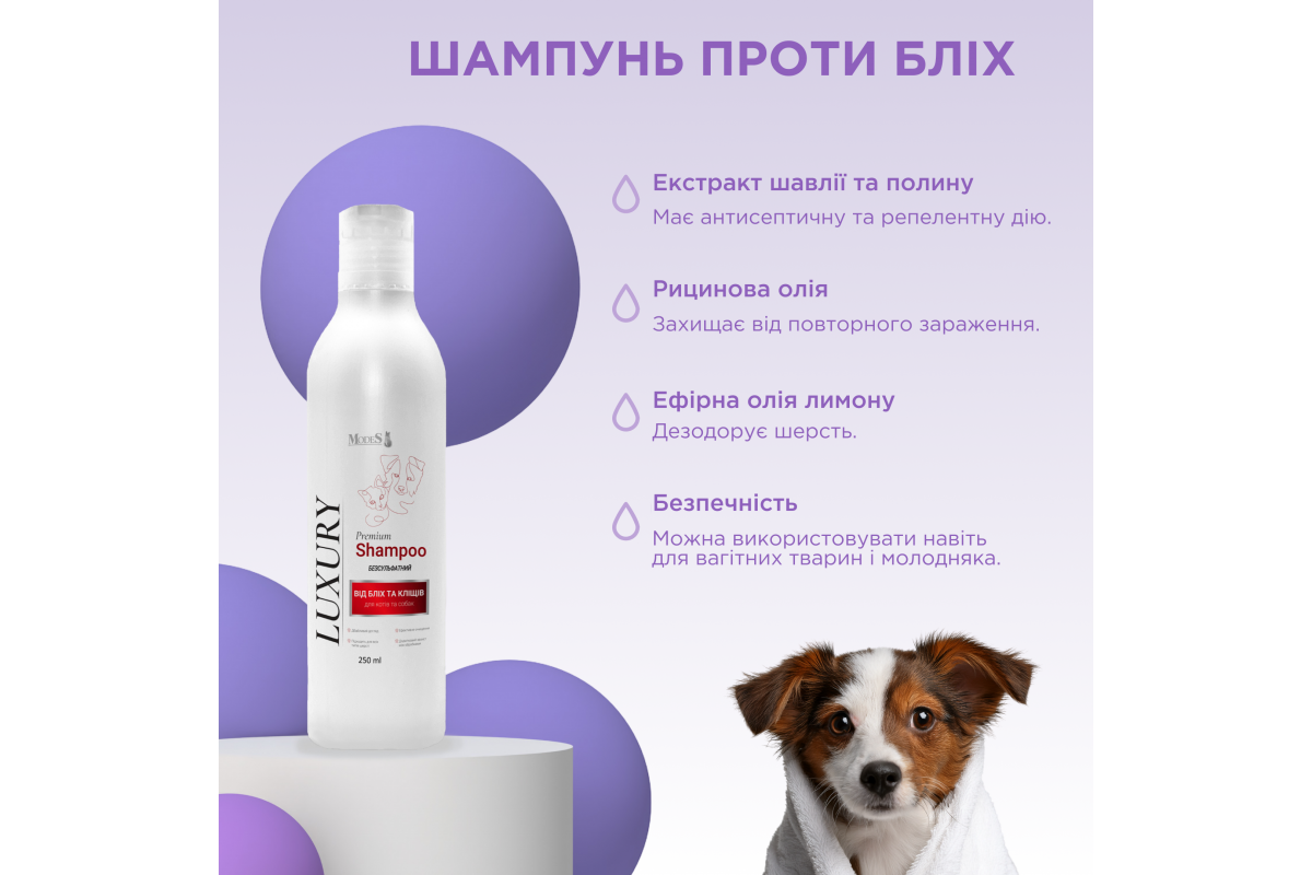 Лакшері преміальний шампунь від бліх та кліщів для собак та котів — це безпечний природний засіб проти бліх. Завдяки натуральній формулі, шампунь можна використовувати з першого місяця життя тварини та вагітним тваринам.
