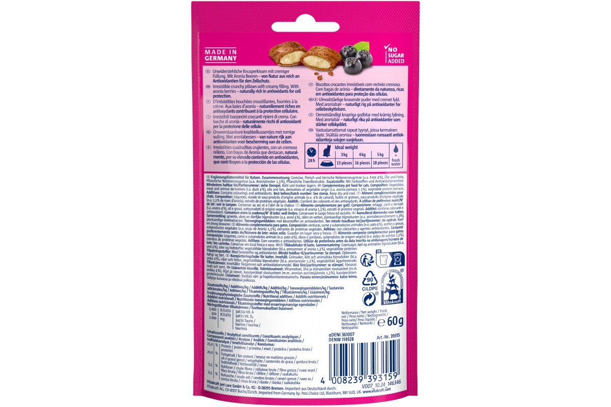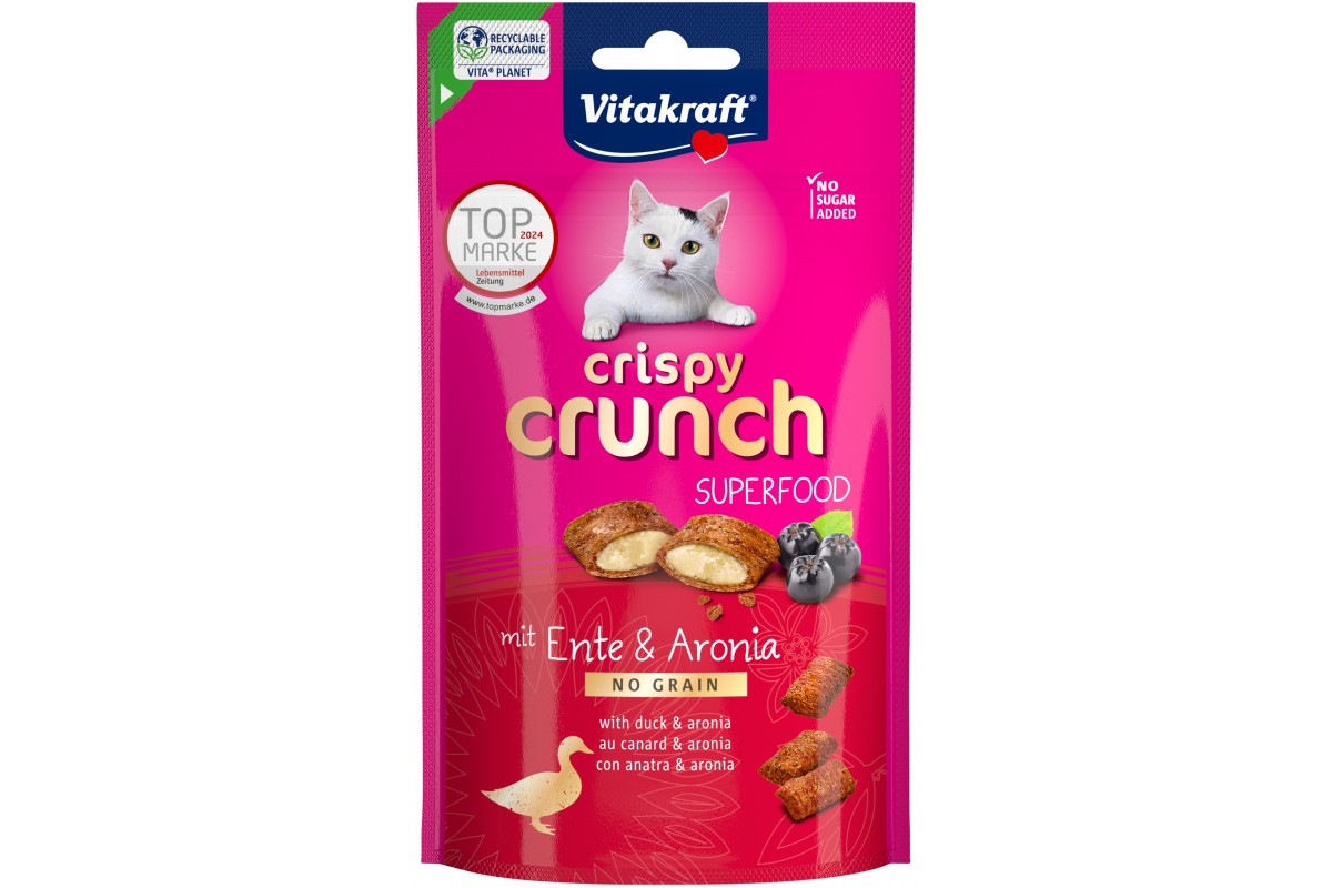Хрусткі ласощі Vitakraft Crispy Crunch duck +aronia, для котів, з кремовою начинкою з качкою та ягодами, 60 гр
