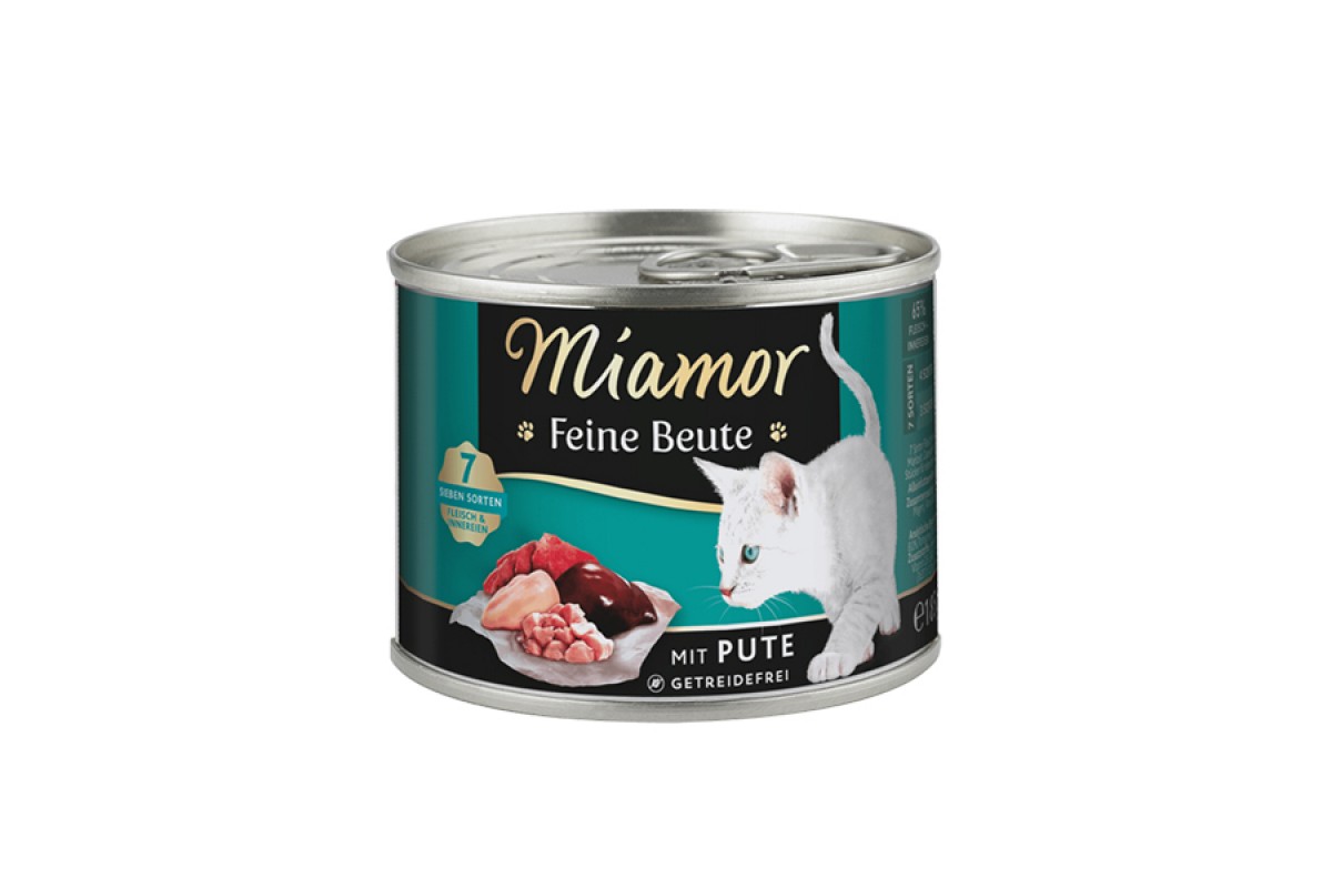Miamor Feine Beute mit Pute – це 7 видів м’яса та субпродуктів: 7 смаків для 7 життів вашого кота! Цей вологий корм створений з урахуванням природних потреб котів, адже в дикій природі вони харчуються виключно м’ясом. Тому в складі немає пшениці, кукурудзи, сої та інших наповнювачів – тільки цінні м’ясні інгредієнти, які потрібні для енергії, сили та здоров’я вашого улюбленця.