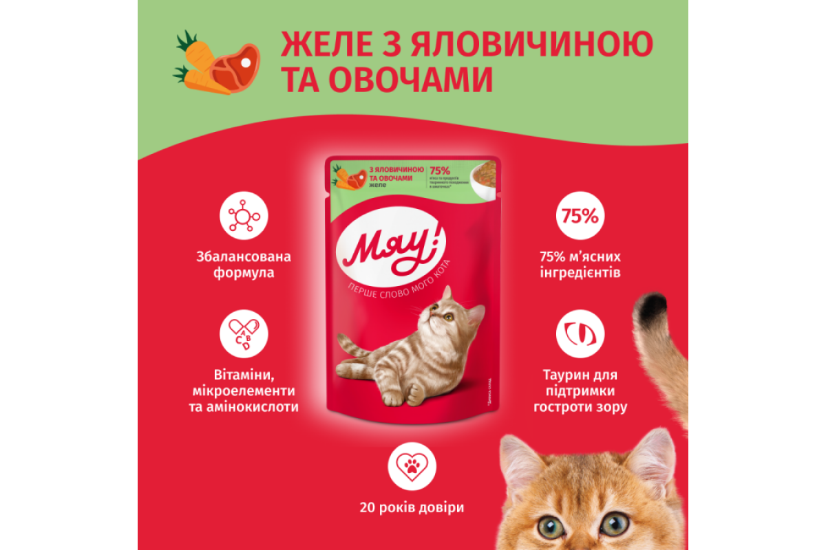 Вологий корм Мяу!, для дорослих котів, желе з телятиною та овочами, 85 г