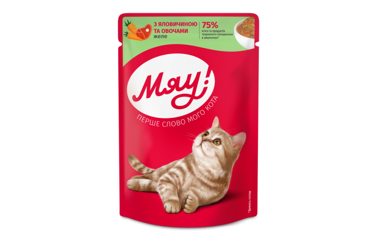 Вологий корм Мяу!, для дорослих котів, желе з телятиною та овочами, 100 г