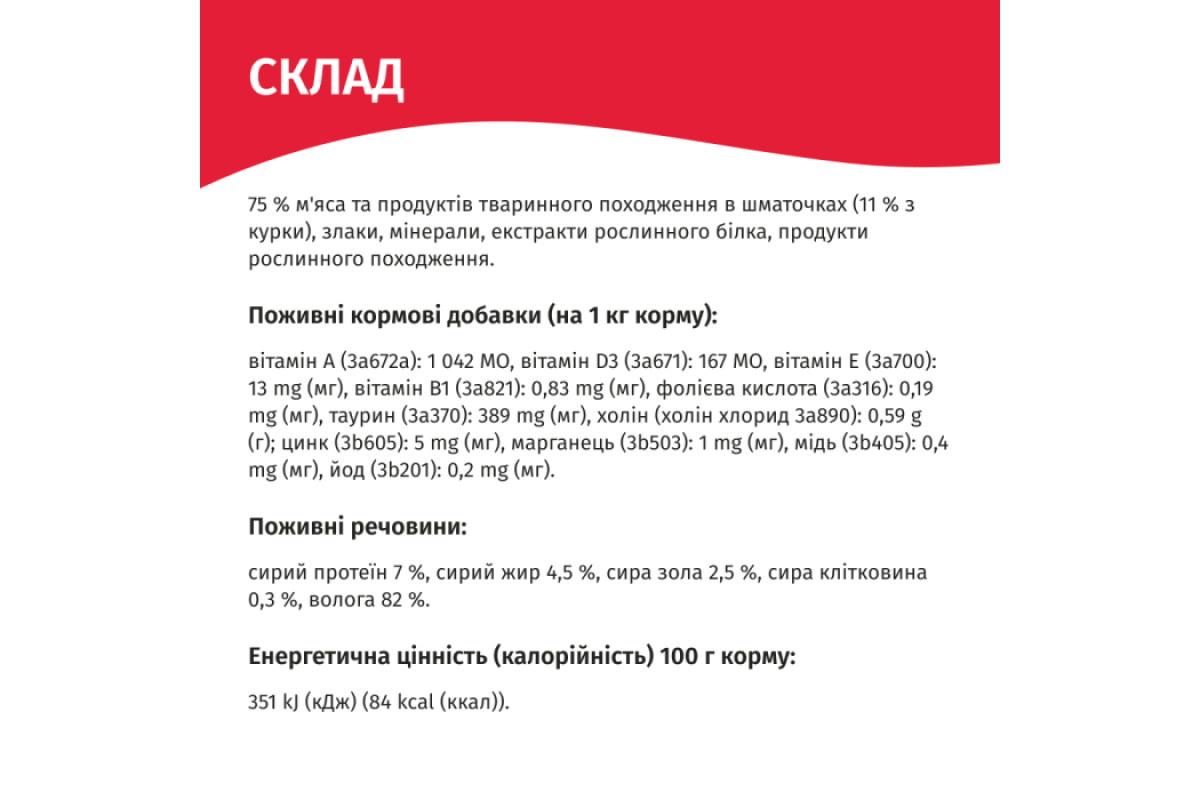 м'ясо та субпродукти тваринного походження, у тому числі з курки не менше 4%, злаки, екстракти рослинних білків, мінерали, вітаміни (таурин), цукри, барвник Е171.