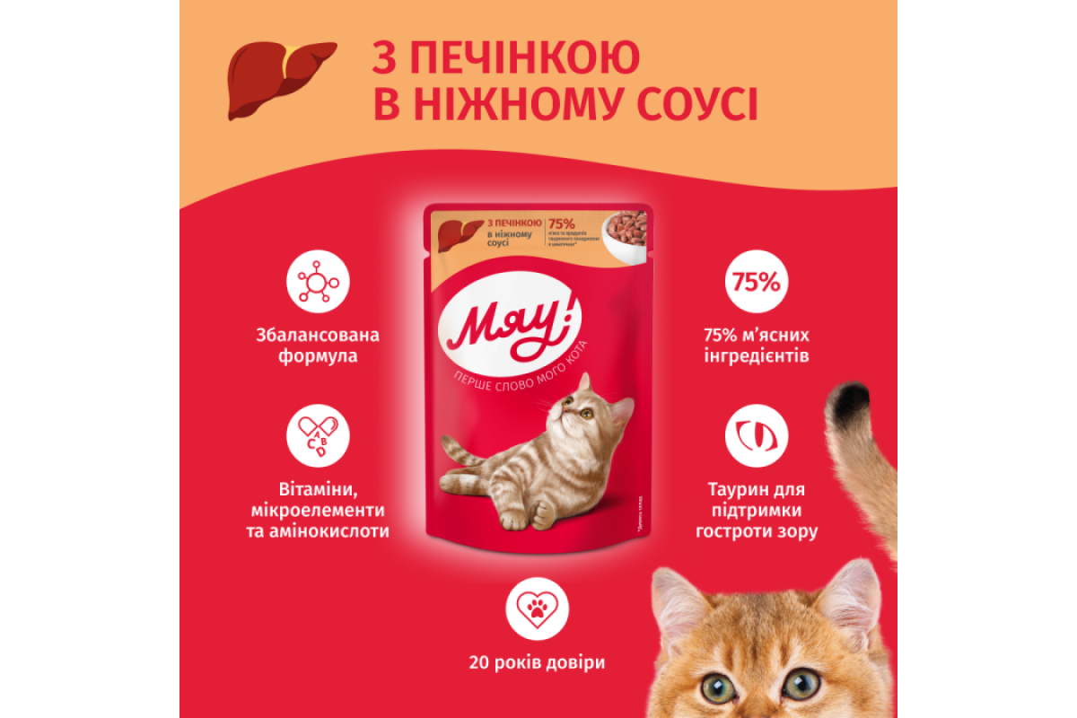 Повнораціонний консервований корм "Мяу" для дорослих котів з печінкою в ніжному соусі.