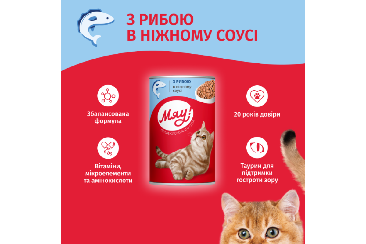 Повнораціонний консервований корм "Мяу" для дорослих котів з рибою в ніжному соусі.