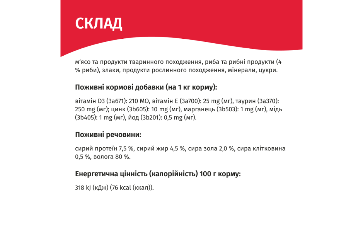 М'ясо та субпродукти тваринного походження, злаки, риба та субпродукти з риби не менш ніж 4 %, мінерали та вітаміни, екстракти рослинних білків, барвники Е171, Е127 і Е150.