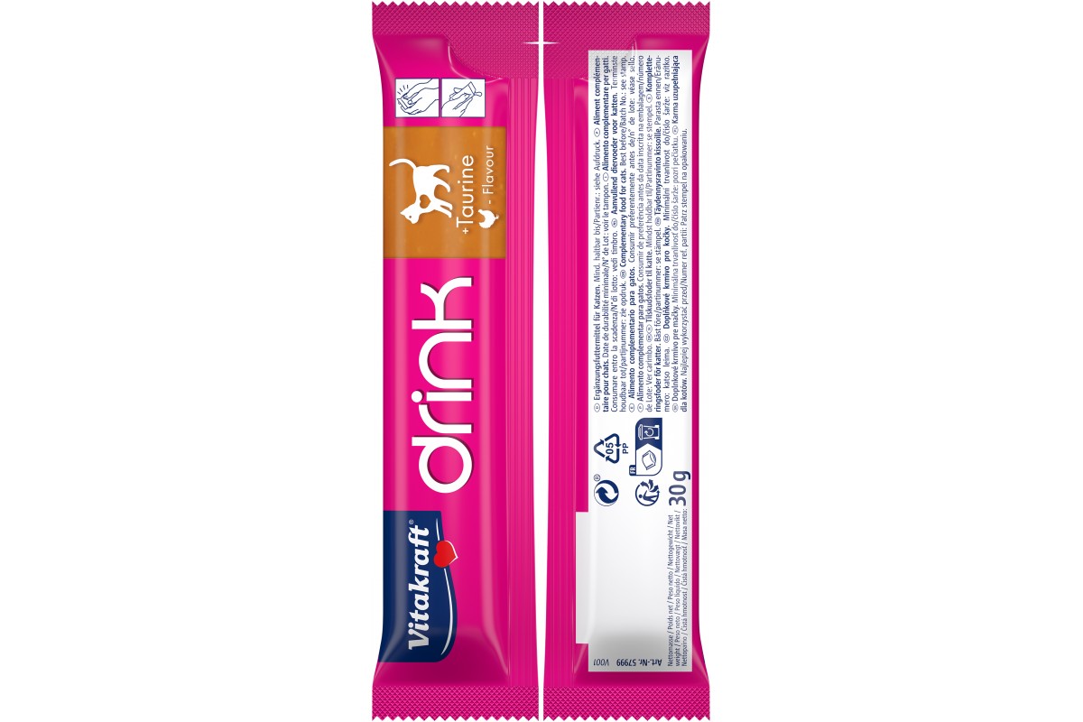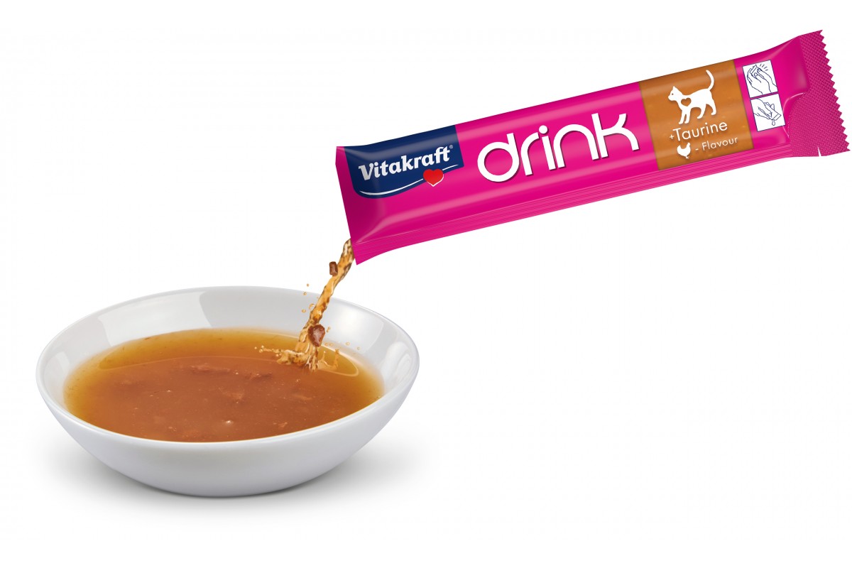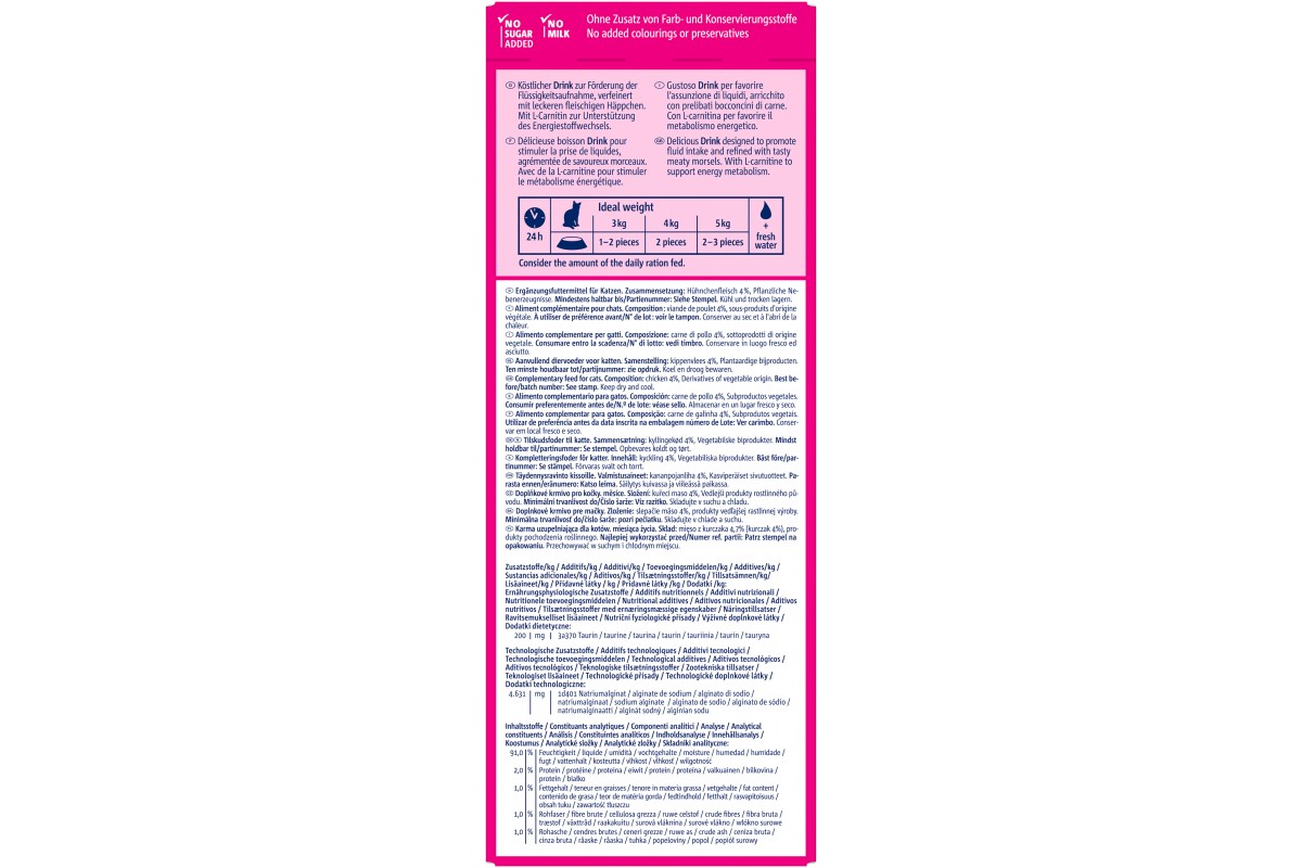 Напій зі справжніми шматочками м'яса — смачний прикорм для котів. Ідеально підходить котам, яким не вистачає рідини. Напій збагачено таурином і L-карнітином, які підтримують життєву енергію кота. Без додавання цукру та молока. Кожна порція в окремому стіку.