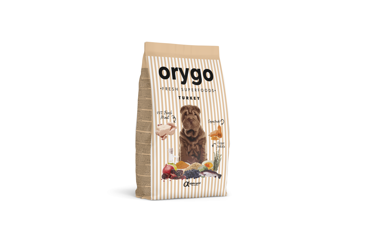 Склад: 55% свіжа індичка (м’ясо, печінка, серце), 30% свіжа курятина, частково гідролізований крохмаль, гарбуз 4%, рослинний гліцерин. ORYGOFORMULA 2.6%: продукти ферментації дріжджів, S. Cerivisiae (MOS), куркума, оливкова олія (джерело поліфенолів), інулін (джерело ФОС), м’якоть цикорію, шавлія, кіноа, м’ята, фенхель, юка мохаве, розмарин, орегано, чебрець, валеріана, екстракт чорниці (джерело антоціанозидів та танінів), екстракт гранату (джерело елагової кислоти), розторопша (джерело силімарину), солодка, алое вера без алоїну, екстракт артишоку (джерело цинарину), прополіс. Яєчна мембрана (джерело глюкозаміну, хондроїтину сульфат та колагену I, V, X), олія форелі 500 мг/кг (джерело омега 3, ЕПК, ДГК).