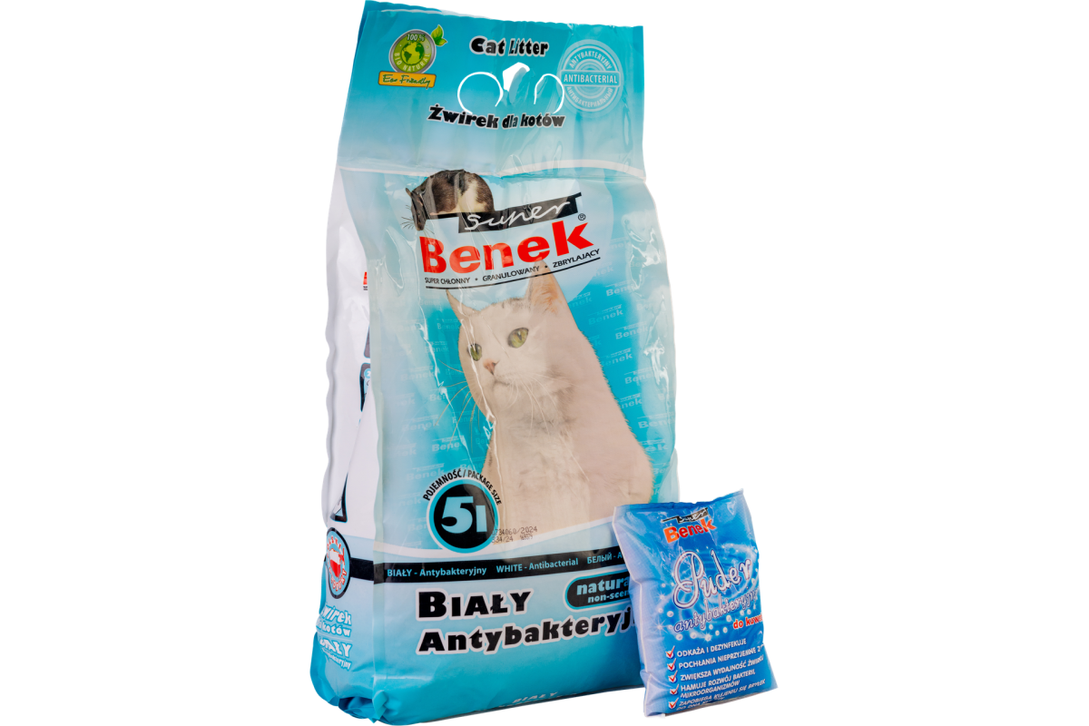 Характерною особливістю Super Benek є білий колір гранул. Коли вихованець сходить у лоток, наповнювач змінює колір, завдяки чому його легко помітити серед свіжого та прибрати. Наповнювач дуже практичний у використанні та підходить для котів усіх порід.