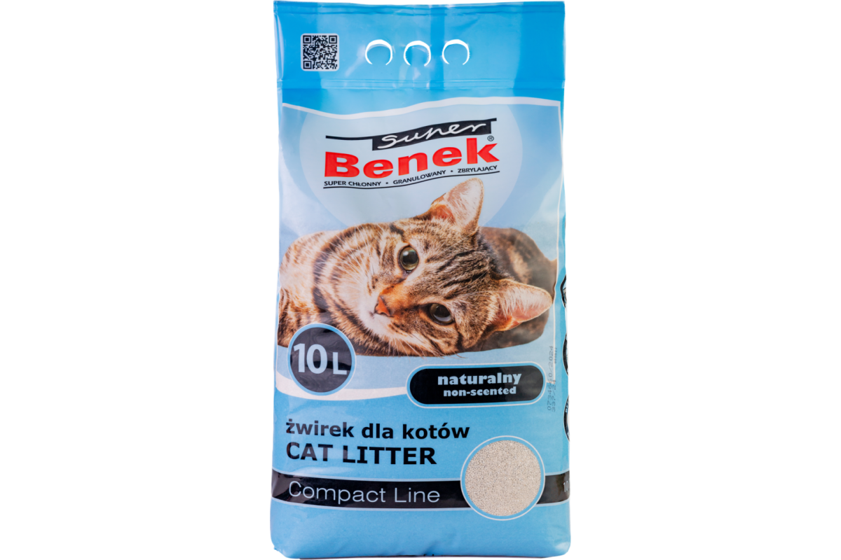 Super Benek Compact Naturalny - Супер Бенек Комакт Натуральний - наповнювач бентонітовий для котячих туалетів (без запаху) - дрібнозернистий наповнювач, що комкується. Складається з натурального білого мінералу бентоніту, який має унікальні поглинаючі властивості. Має слабкий натуральний приємний запах і відмінно підійде для котів, які не люблять ароматизовані наповнювачі.