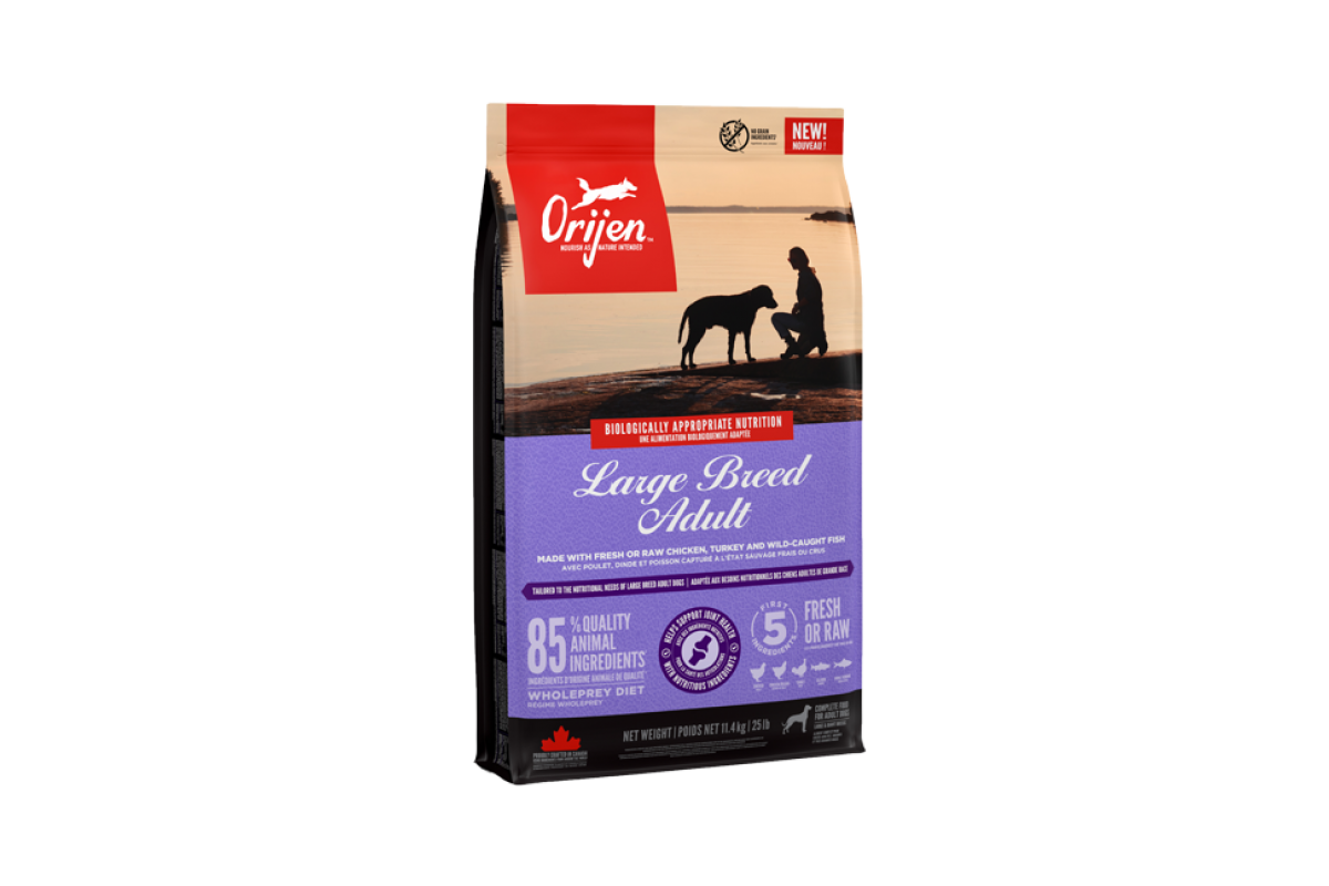 Сповнений м’ясними інгредієнтами згідно з концепцією WholePrey (здобич цілком), включаючи високопоживні органи, ORIJEN Large Breed Adult виготовляється з найбільш поживних та соковитих частин здобичі, забезпечуючи харчування якого потребують собаки великих порід.