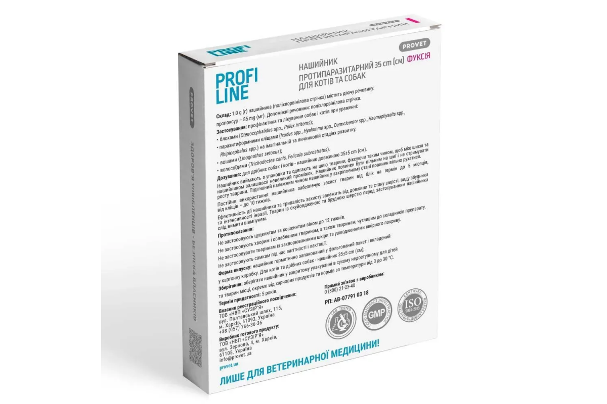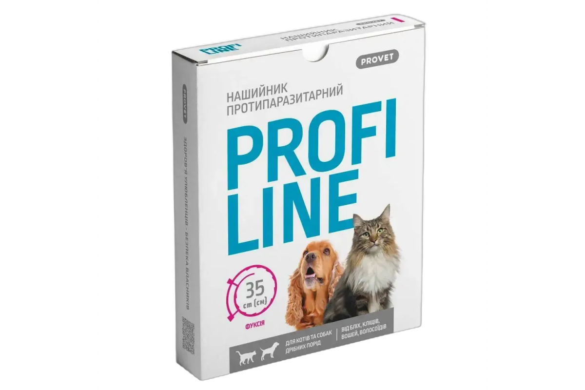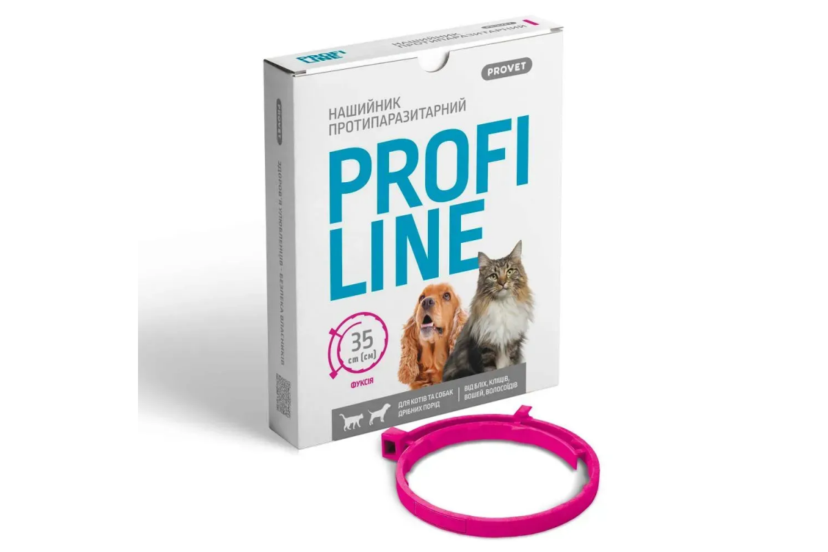 Нашийник протипаразитарний Profiline має високу ефективність проти преімагінальних та імагінальних фаз розвитку бліх, вошей, волосоїдів та іксодових кліщів, які паразитують на котах.