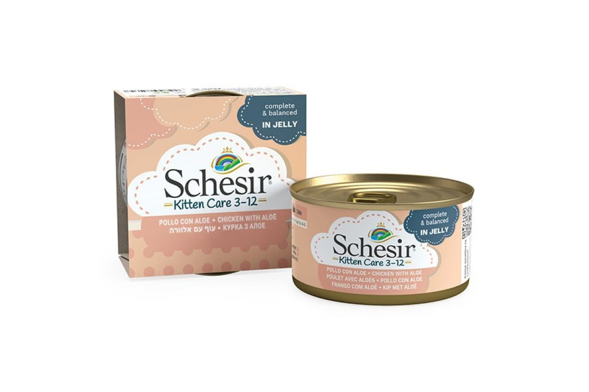 Schesir Курка з Алое – 100% натуральні консерви з куркою для кошенят віком 1-12 місяців. Тільки найкращі шматочки курячого філе, приготовані на пару та оброблені вручну. Без ароматизаторів, барвників та консервантів.