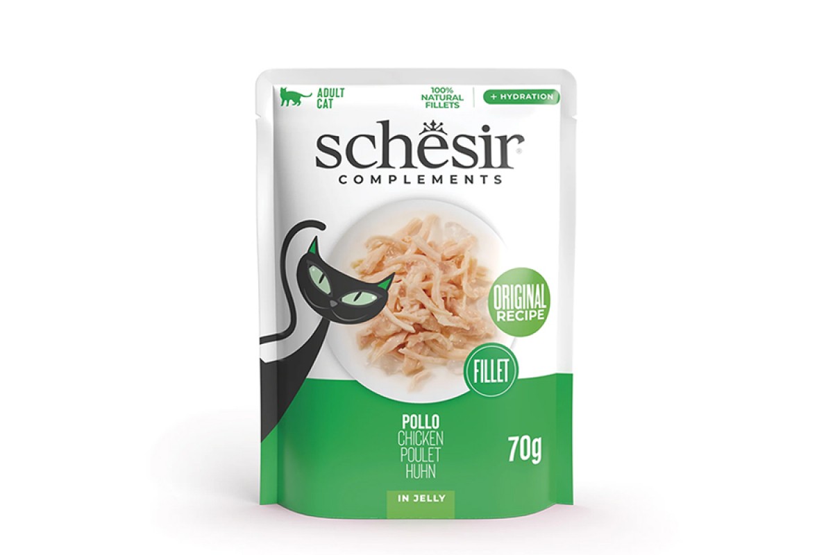 Консерви для котів Schesir Chicken в желе — це вологий додатковий корм преміальної якості зі 100% натуральним складом, розроблений з урахуванням природних харчових потреб котів. В основі рецепта — добірне куряче філе, яке є джерелом легкозасвоюваного тваринного білка, необхідного для підтримки м’язової маси, активності та загального самопочуття улюбленця. Прозоре овочеве желе підкреслює соковитість курки та робить текстуру корму особливо апетитною.