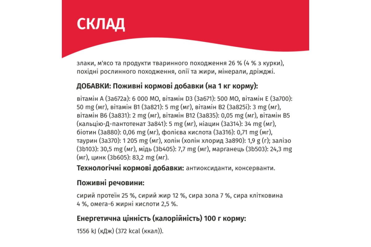 Добавки (на 1 kg (кг) корму): Вітамін А (3a672a): 6 000 МО, вітамін D 3 (3a671): 500 МО, вітамін Е (3a700): 50 mg (мг), вітамін К 3 (3a710): 0,4 mg (мг), вітамін В 1 (3a821): 5,0 mg (мг), вітамін В 2 (рибофлавін): 3,0 mg (мг), D-пантотенат кальцію (3a841): 5,0 mg (мг), ніацин (3а314): 34,0 mg (мг), вітамін В 6 (3a831): 2,0 mg (мг), фолієва кислота (3a316): 0,71 mg (мг), вітамін В 12 (ціанокобаламін): 0,153 mg (мг), біотин (3a880): 0,051 mg (мг), таурин(3a370): 1 205 mg (мг); мікроелементи: сульфат міді пентагідрат (3b405): 30,3 mg (мг), цинк сульфат гептагідрат (3b604): 373,1 mg (мг), сульфат заліза моногідрат (3b103): 82,3 mg (мг), сульфат марганцю моногідрат (3b503): 76,4 mg (мг).